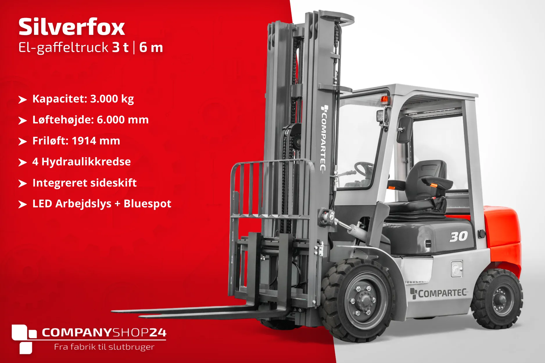 Uanset om du driver tagdækkerfirma, tømrerforretning, stenhuggeri eller snedkeri: Du har ikke brug for en high-end industrigaffeltruck med touchskærme og smarte gimmicks – men derimod en robust maskine, der kan tage fat. Silverfox fra COMPARTEC leverer 3000 kg løftekapacitet, elektrisk kraft uden unødigt lir - og det til en fair pris.