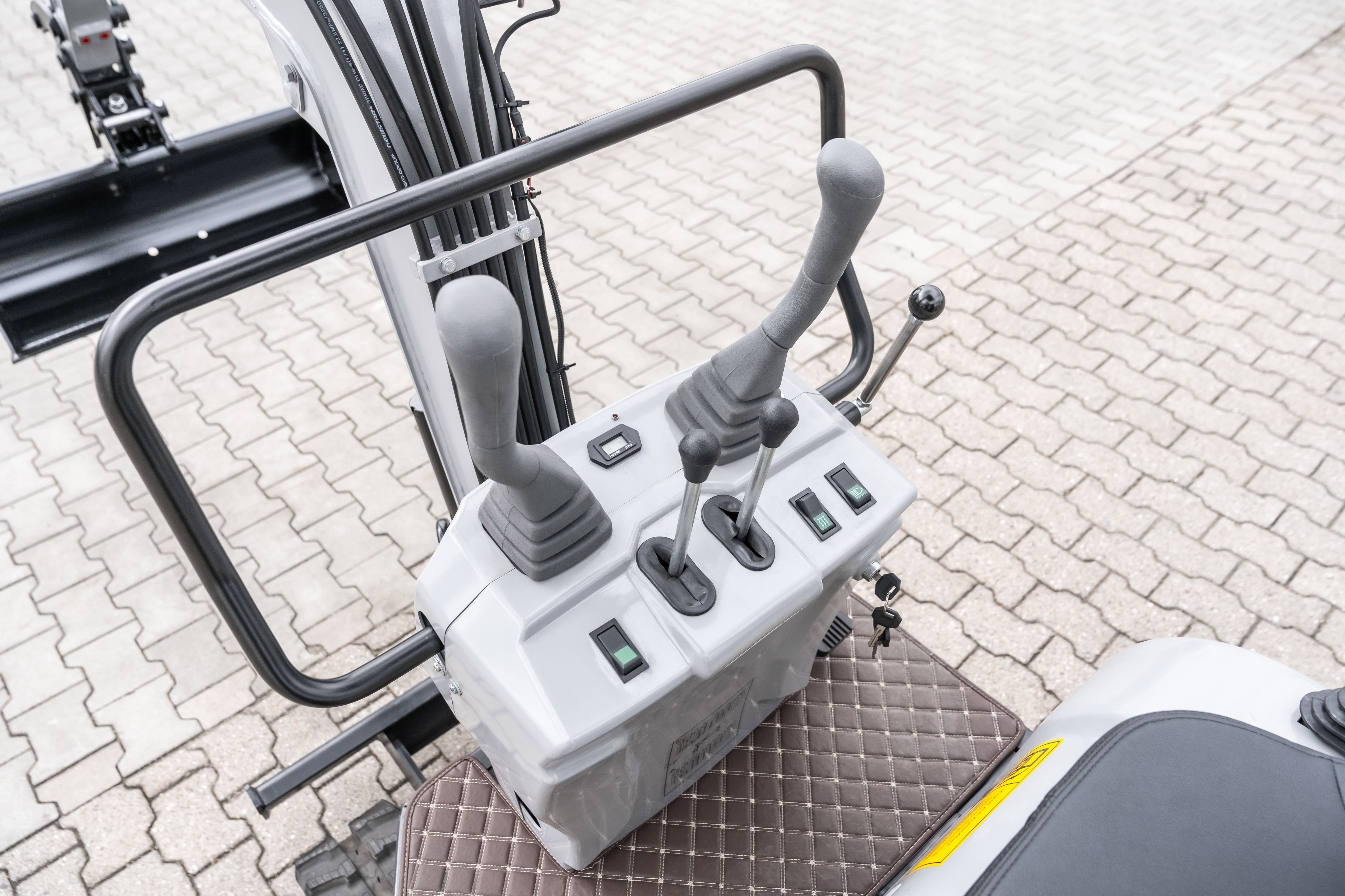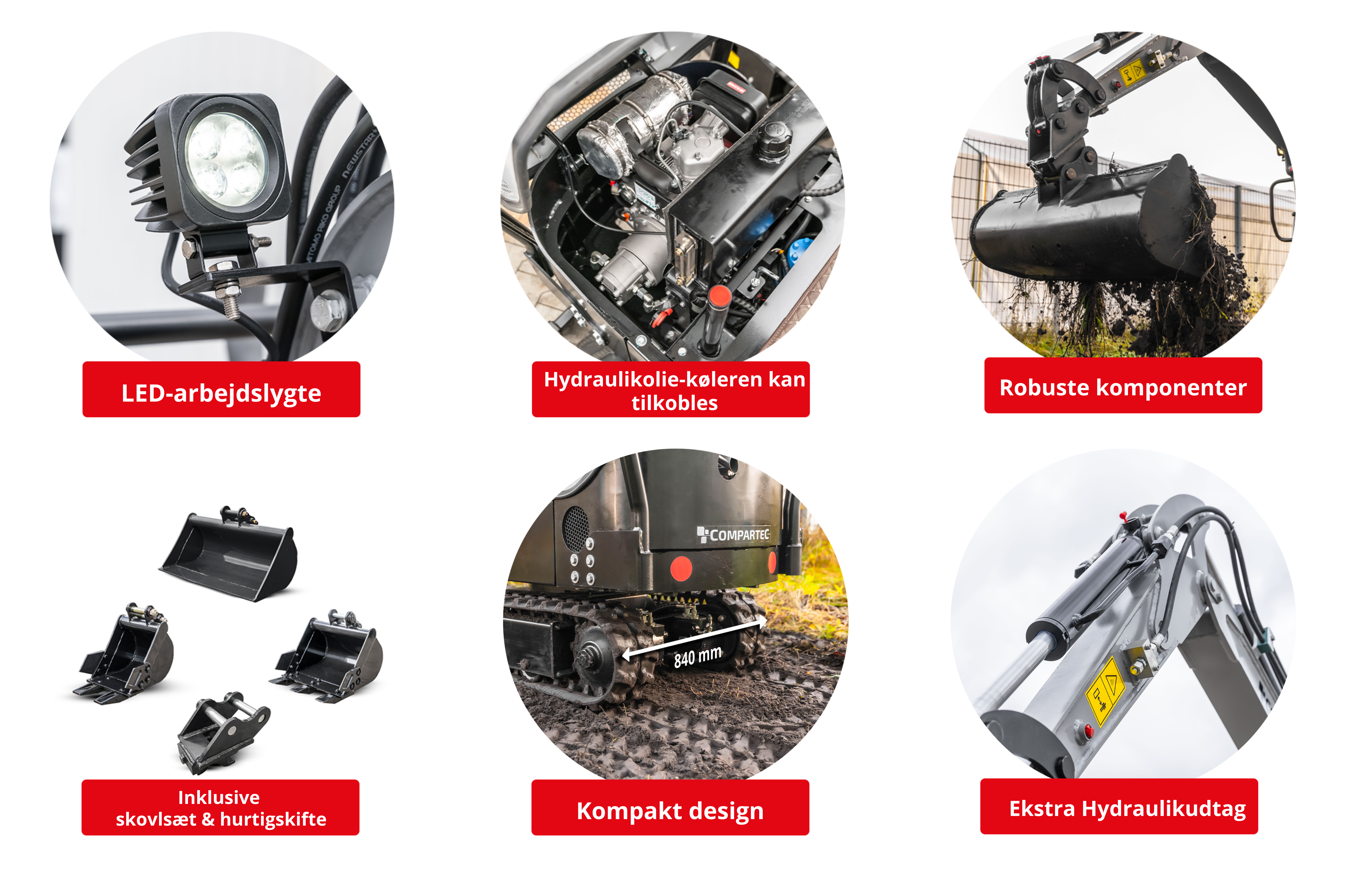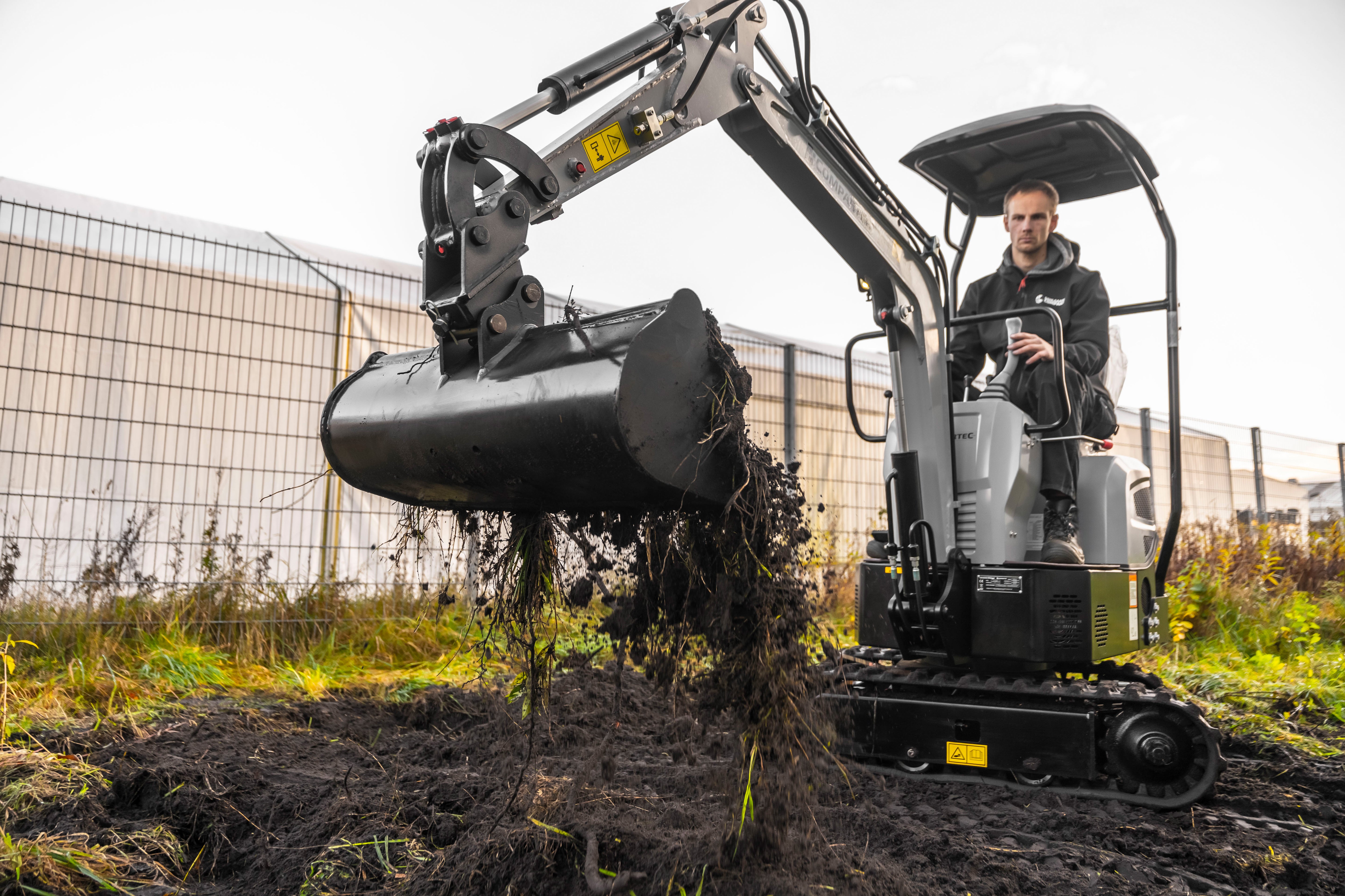 Minigraveren leveres med et alsidigt skovlsæt bestående af 200 mm, 400 mm og 800 mm skovle samt en hurtigskifter, hvilket muliggør hurtig og nem udskiftning af redskaber. Dette øger maskinens fleksibilitet og effektivitet på arbejdspladsen.