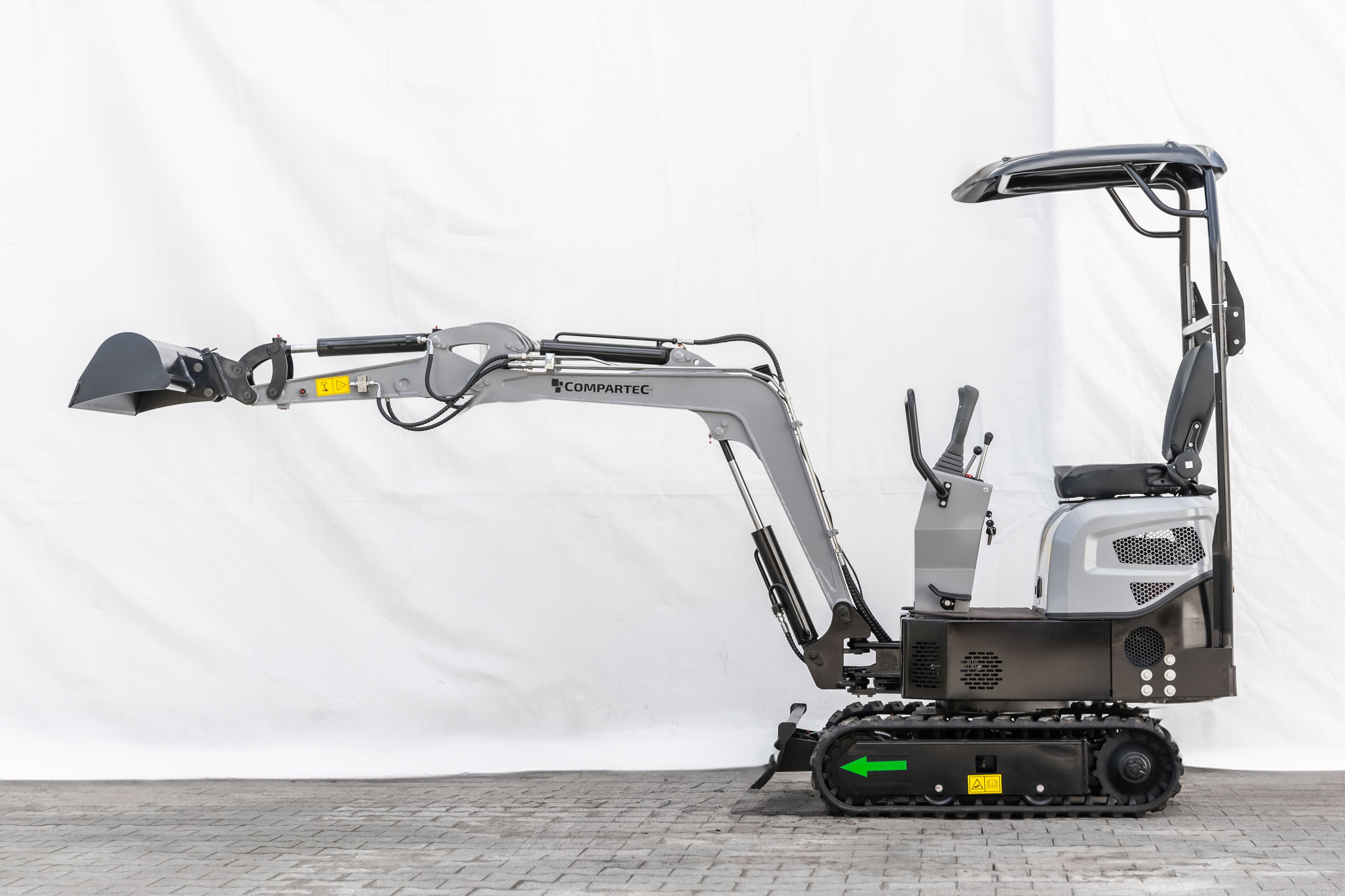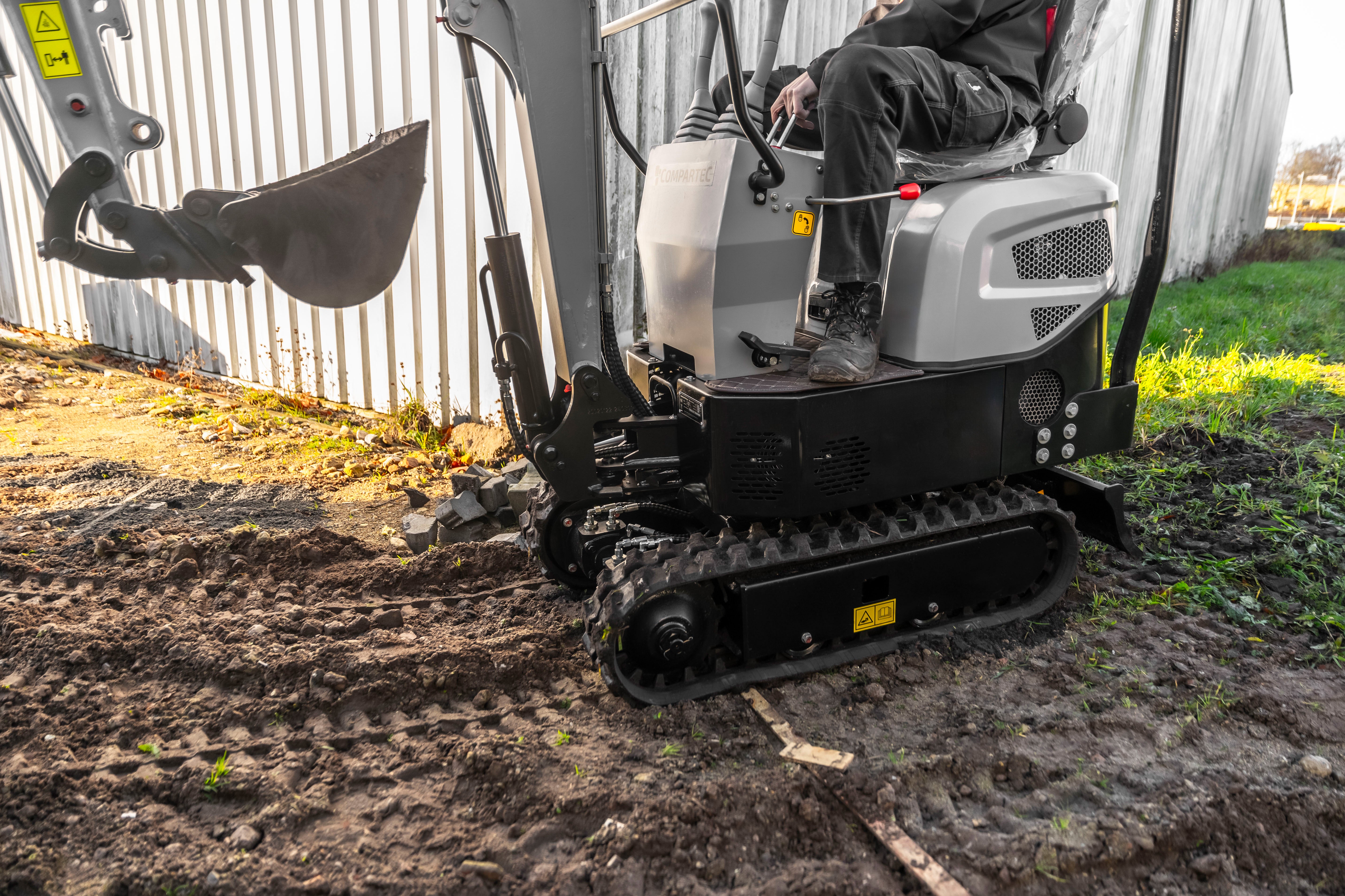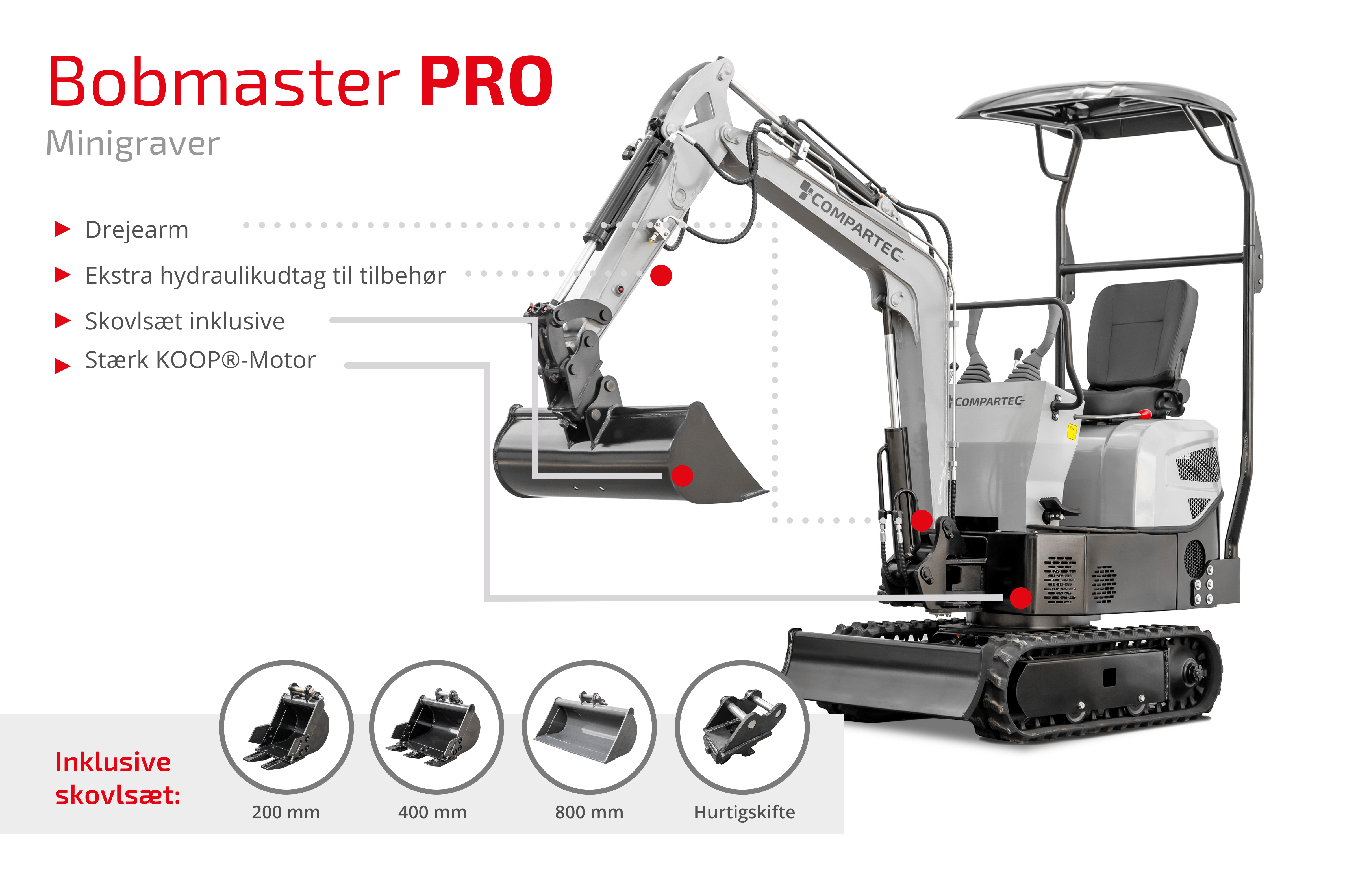 Compartec Bobmaster Pro er en kompakt og kraftfuld dieselminigraver, ideel til arbejde på trange byggepladser og i haver. Med en vægt på kun 890 kg og en bredde på 840 mm kan den nemt passere smalle passager, hvilket gør den perfekt til opgaver i begrænsede områder. Den er udstyret med en 9,5 hk KOOP® dieselmotor (Euro 5), der leverer pålidelig ydeevne til diverse graveopgaver.