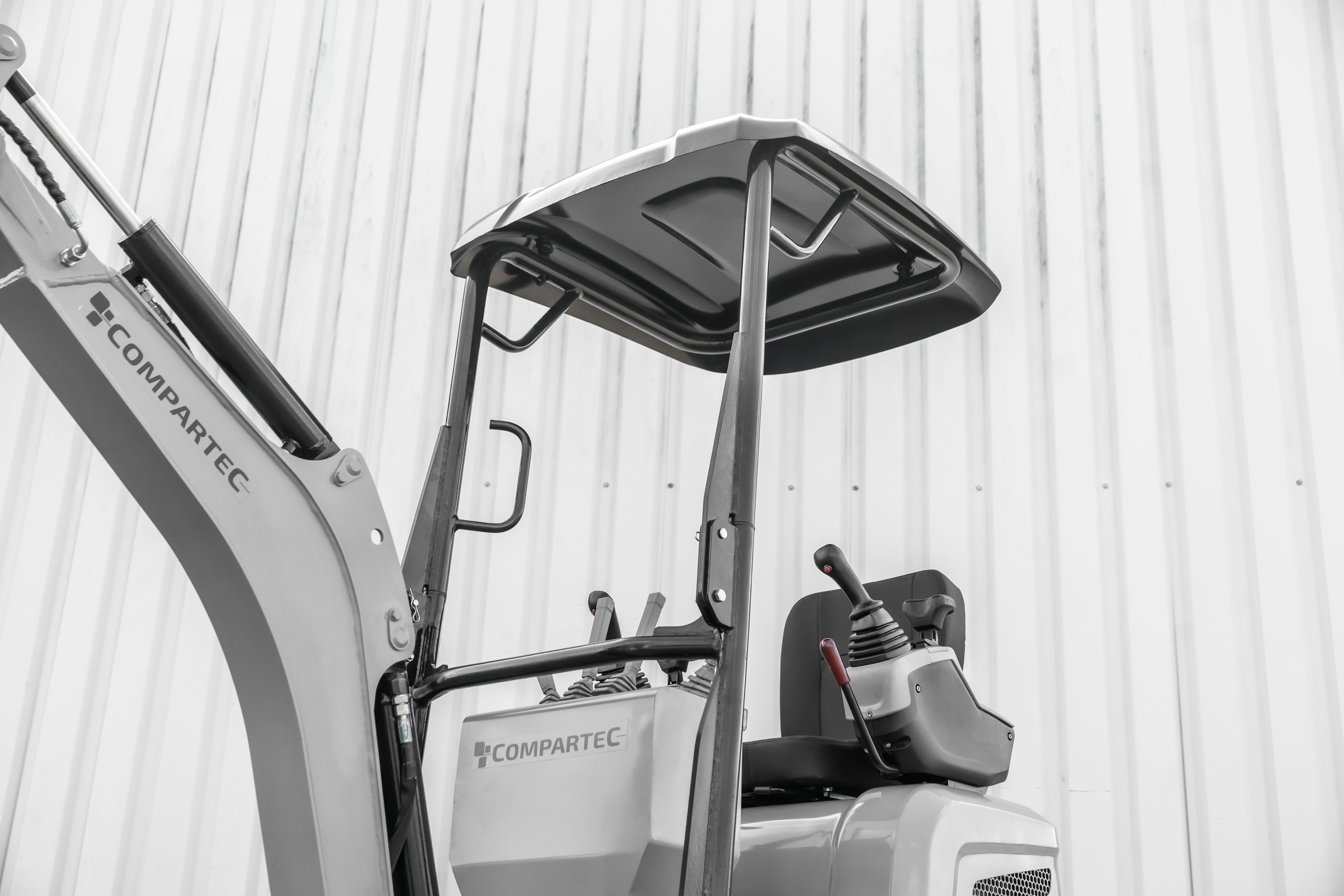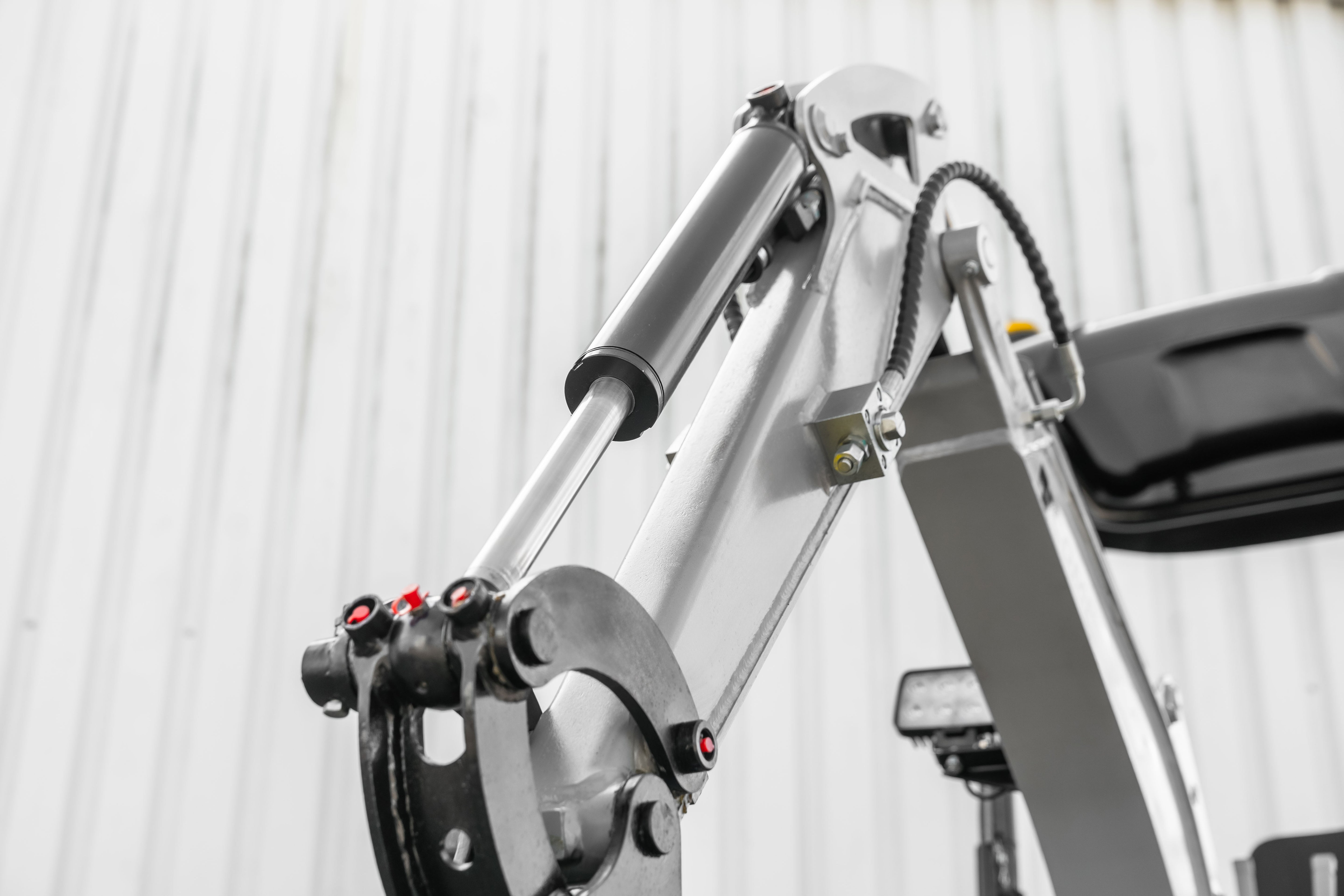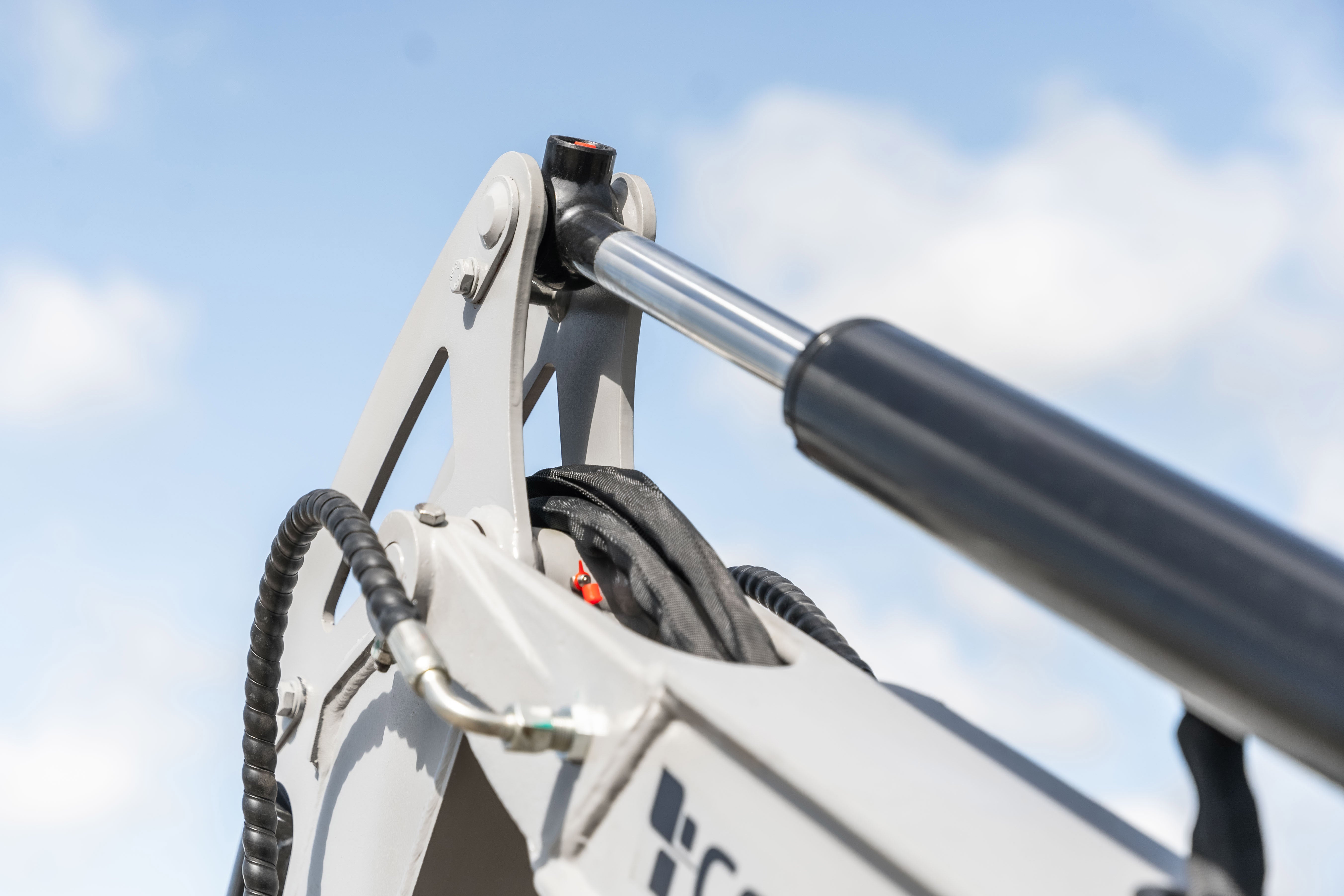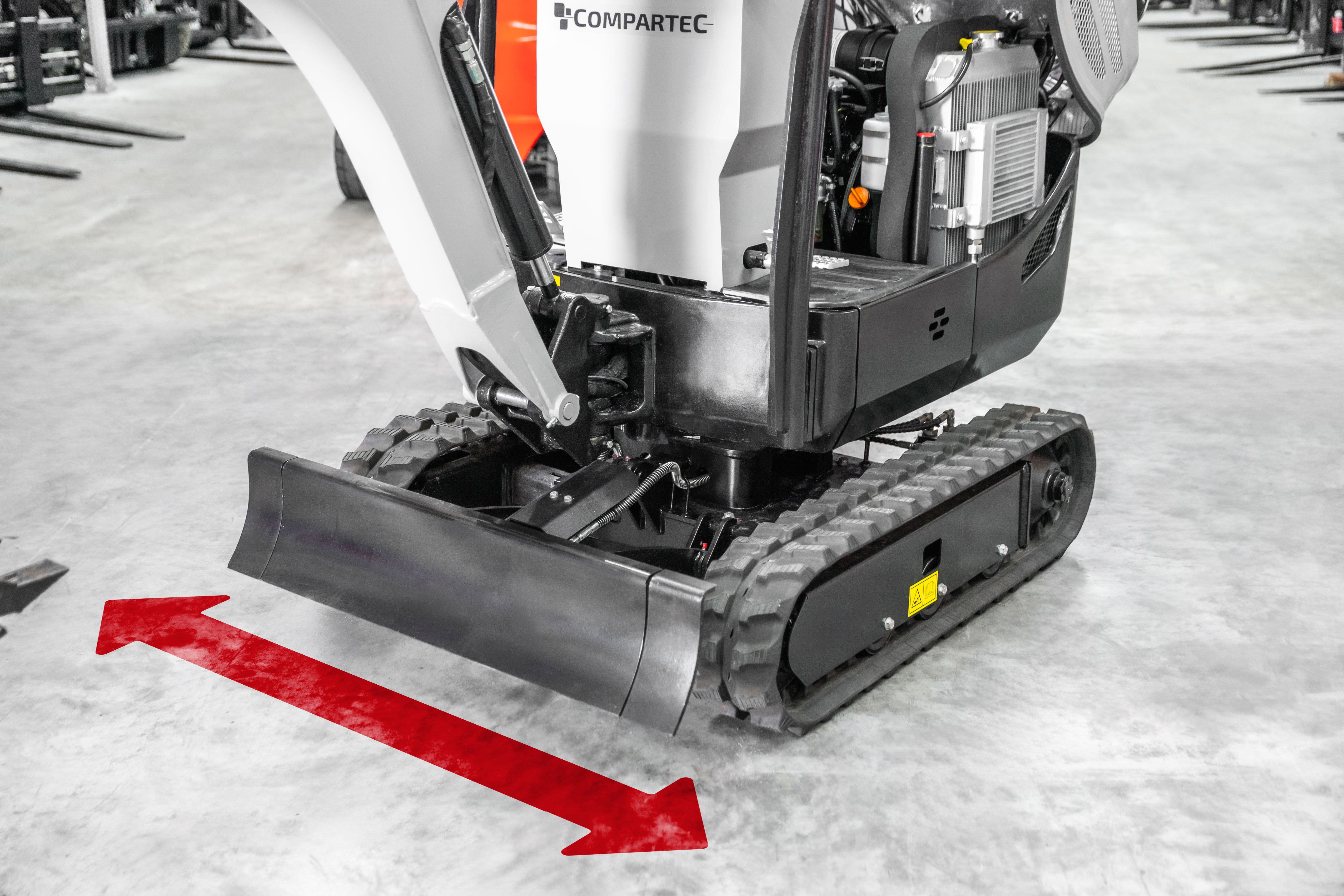 Drejearmen muliggør gravning til både højre og venstre, hvilket øger fleksibiliteten på arbejdspladsen. Den er også udstyret med en 360° drejekrans, der giver fuld rotationsfrihed, hvilket gør det lettere at arbejde i begrænsede områder.