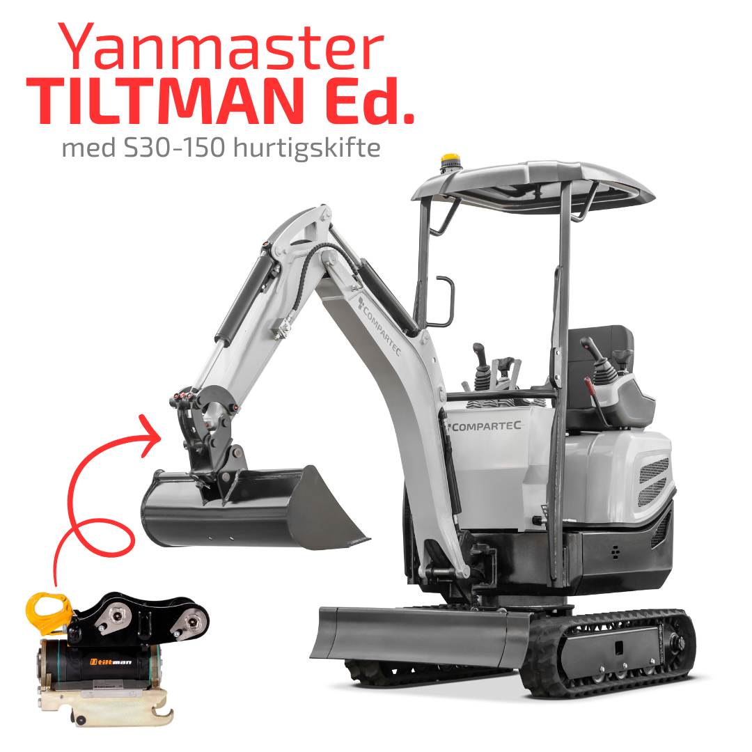 Bobmaster Yanmaster Tiltman Edition S30-150 minigraveren er fuldstændig som vores almindelige Yanmaster, dog med en Tiltman tilt i skiftet (det vil sige alle skovle kan tilte), et S30-150 semiautomatisk hurtigskifte, og skovlsæt på 250, 400 og 800 mm. Den er designet til at levere høj ydeevne i kompakt form, hvilket gør den ideel til arbejde på trange byggepladser og i haver. Med et driftsvægt på 1.200 kg og en bredde på kun 850 mm kan denne minigraver nemt manøvrere gennem smalle passager og porte. Samtidig gør den justerbare undervogn det muligt at stå mere stabilt, når du spreder bælterne til 1050 mm.
