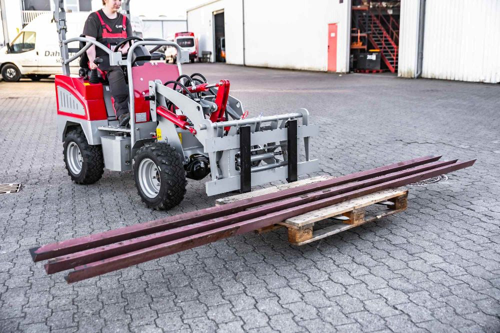 Gør din Weidemaster minilæsser endnu mere alsidig med disse robuste pallegafler. Perfekt til løft og transport af paller, byggematerialer eller andre tunge emner – både på byggepladsen og i landbruget.