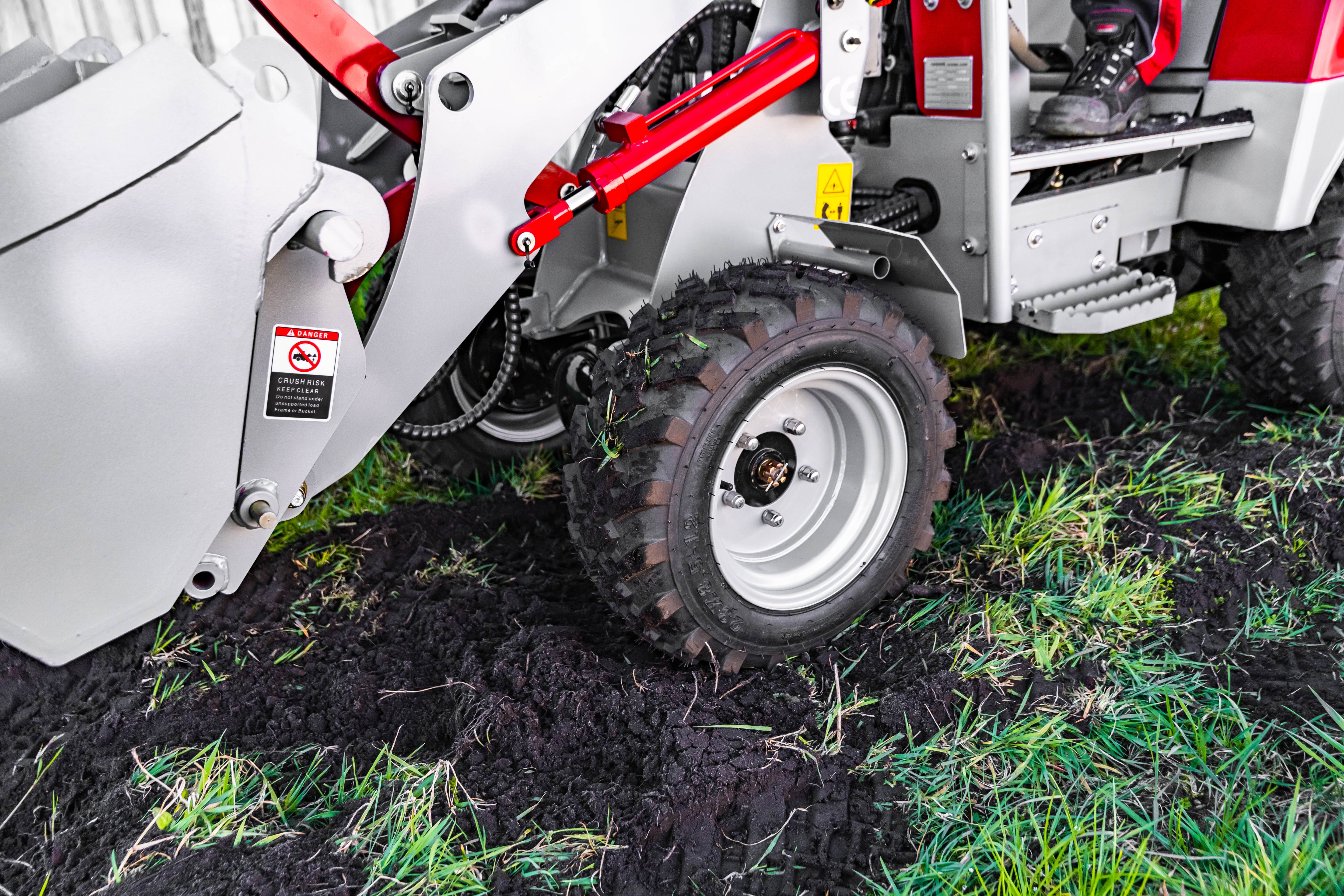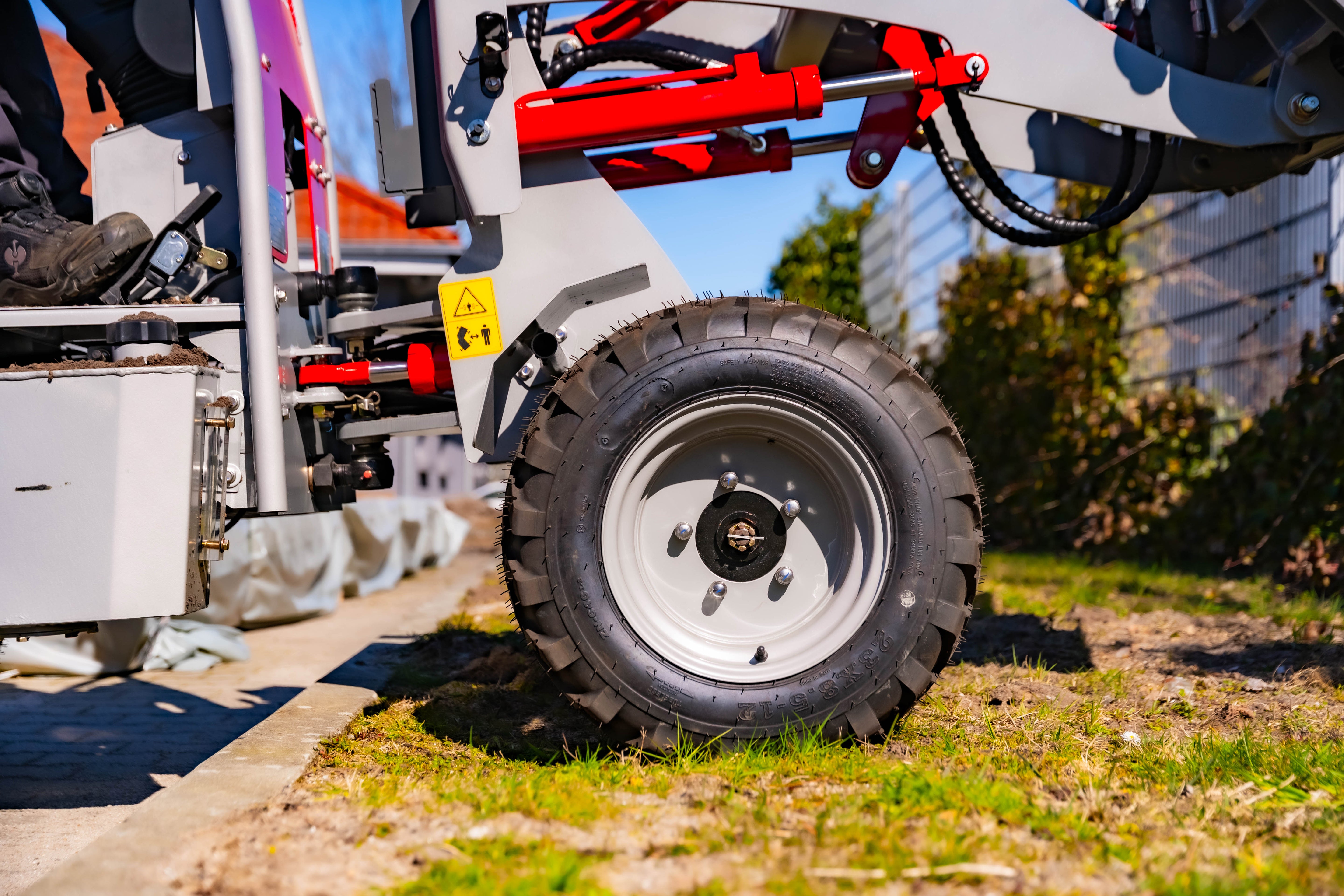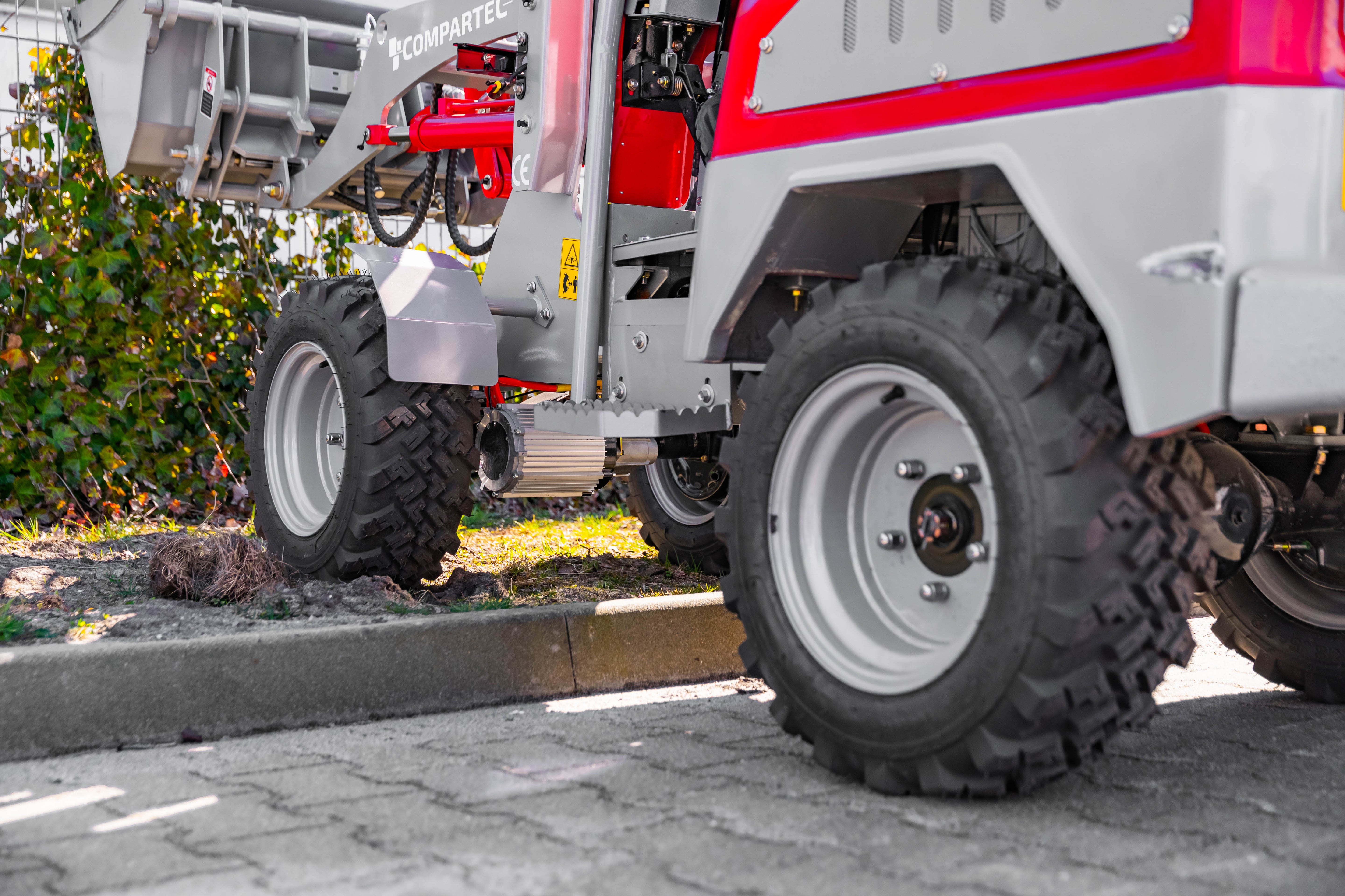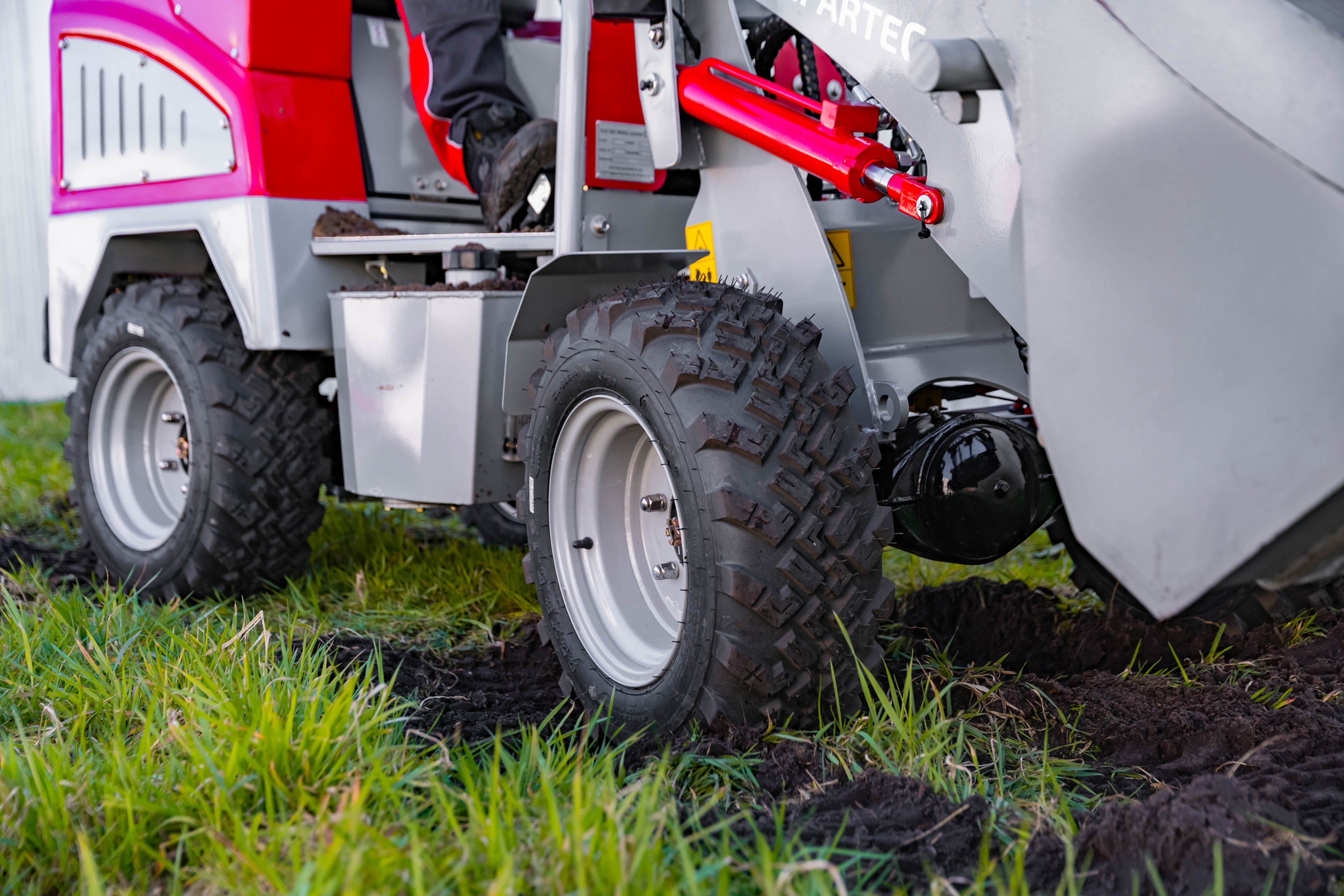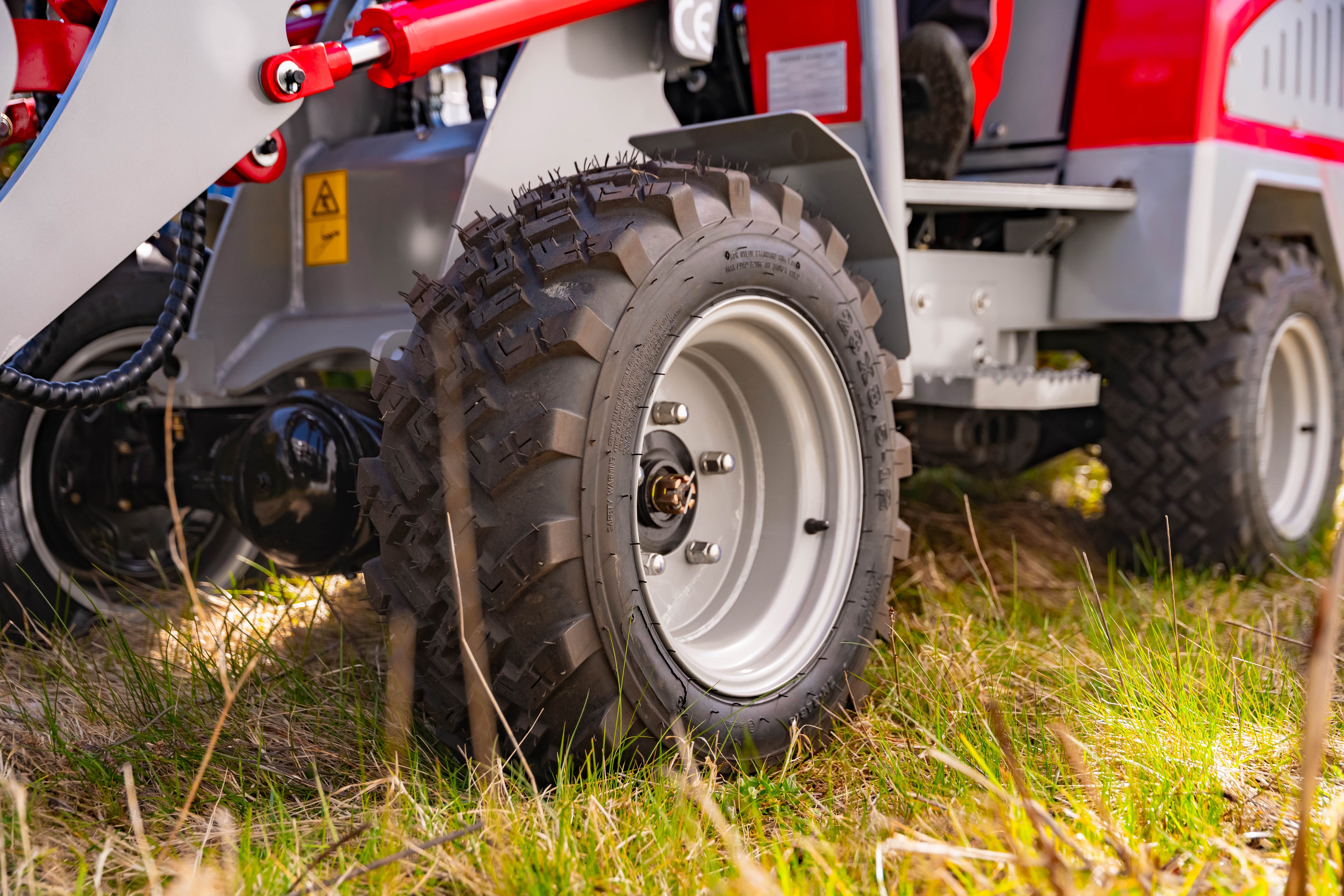 Den robuste konstruktion og det kompakte design med en bredde på 1.050 mm gør det nemt at manøvrere i trange områder. Weidemaster er udstyret med et hurtigskiftesystem, der gør det muligt hurtigt at skifte mellem forskellige redskaber som skovle og pallegafler, hvilket øger maskinens alsidighed. Desuden sikrer de kraftige dæk (29*12.50-15) fremragende trækkraft på forskellige underlag.