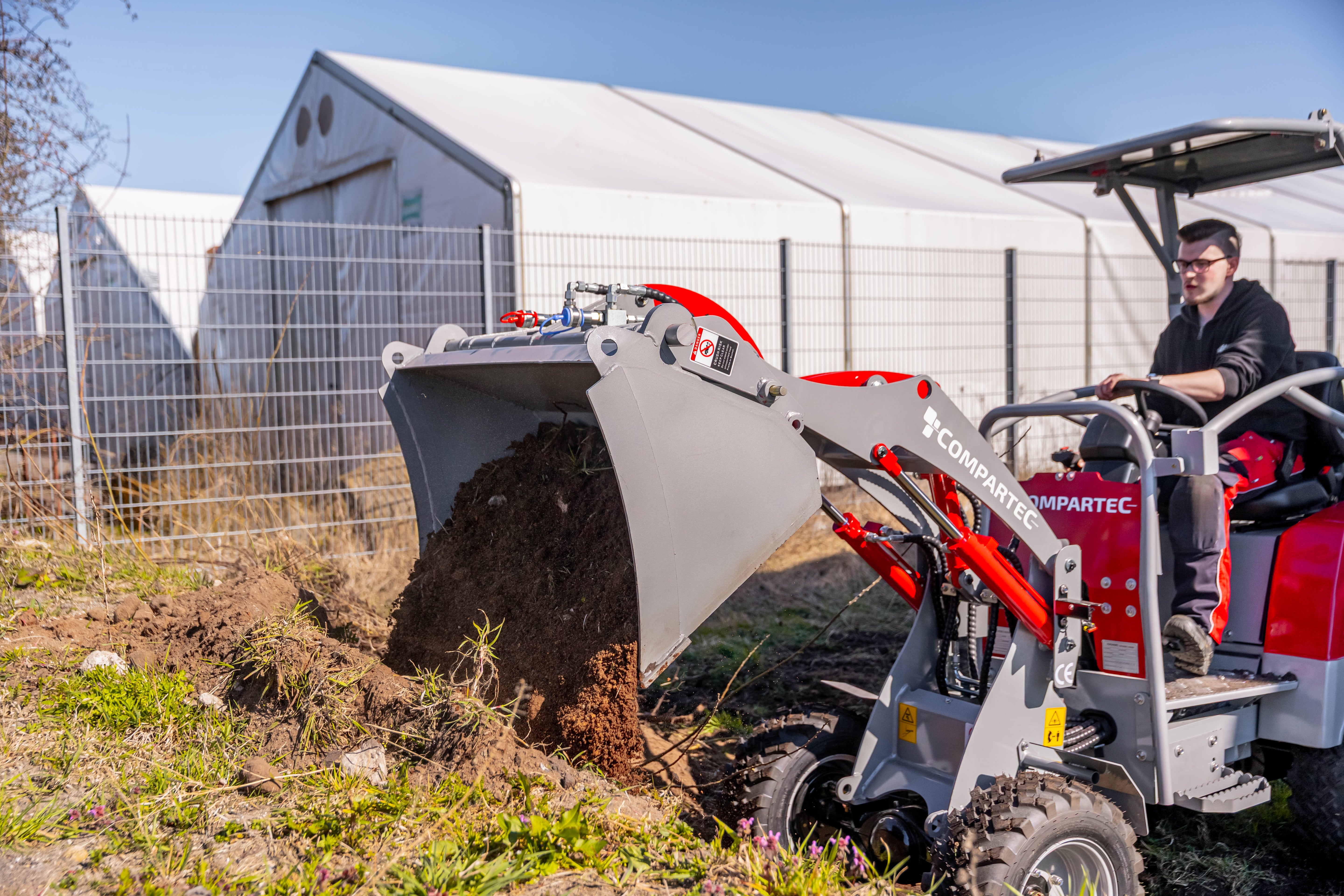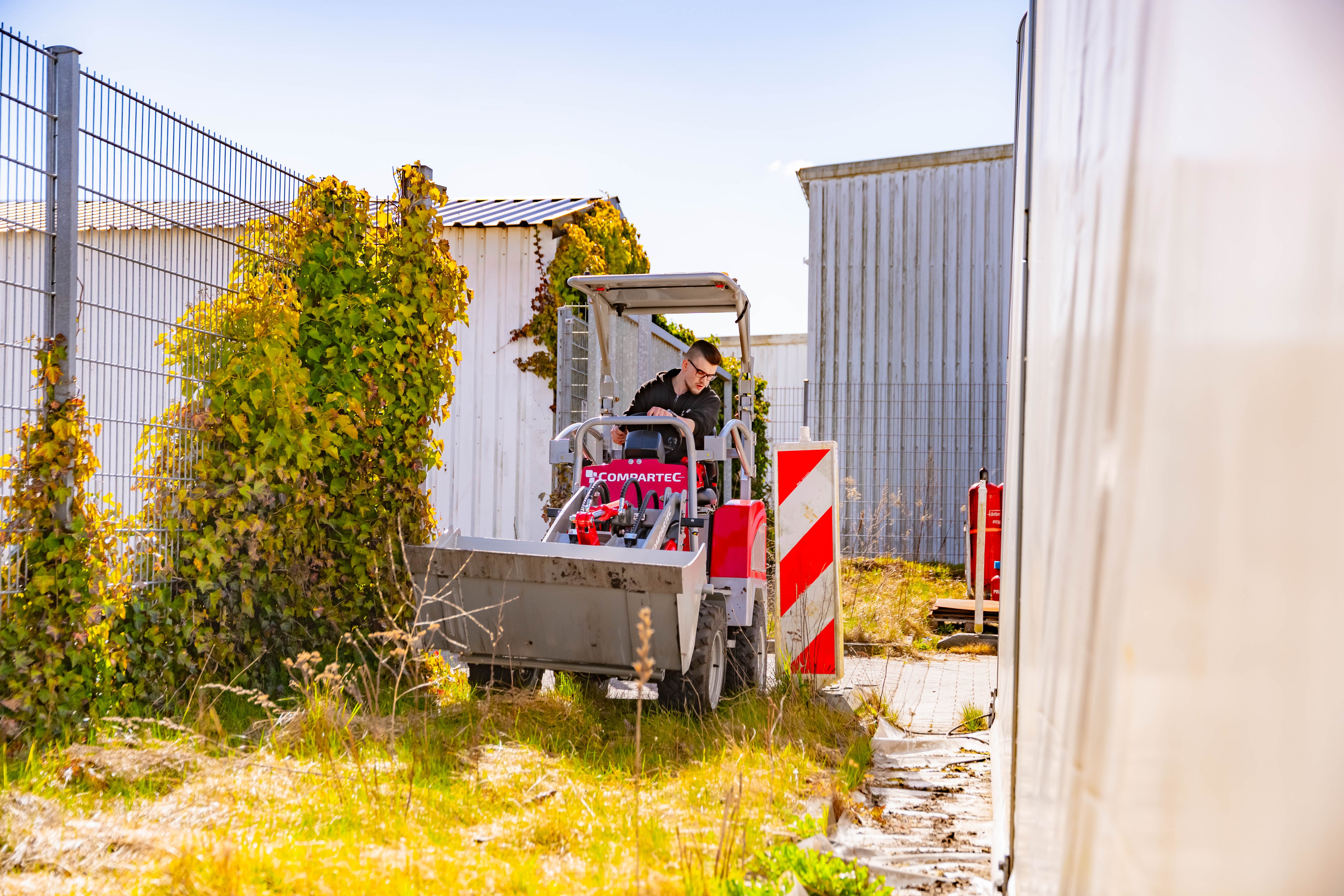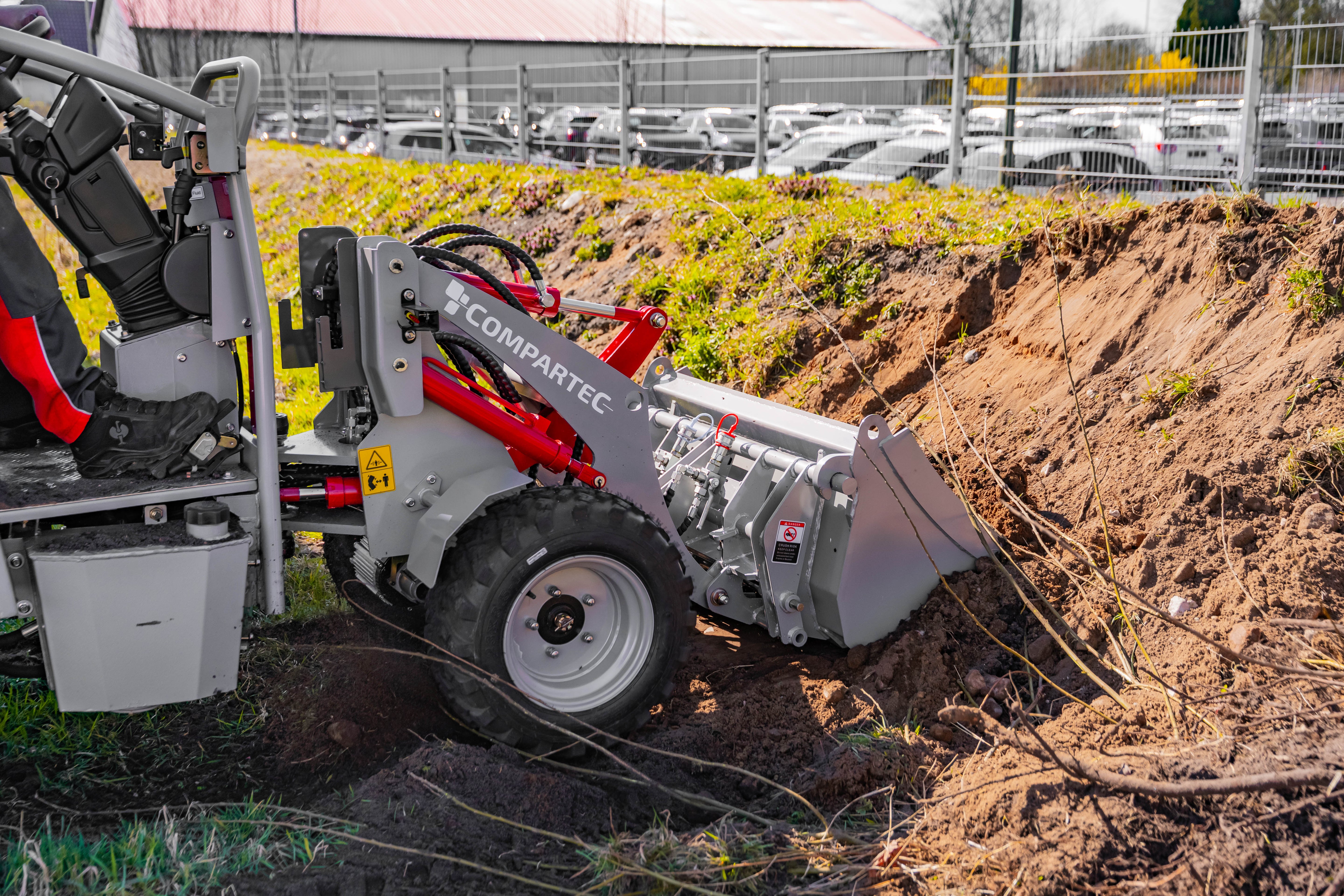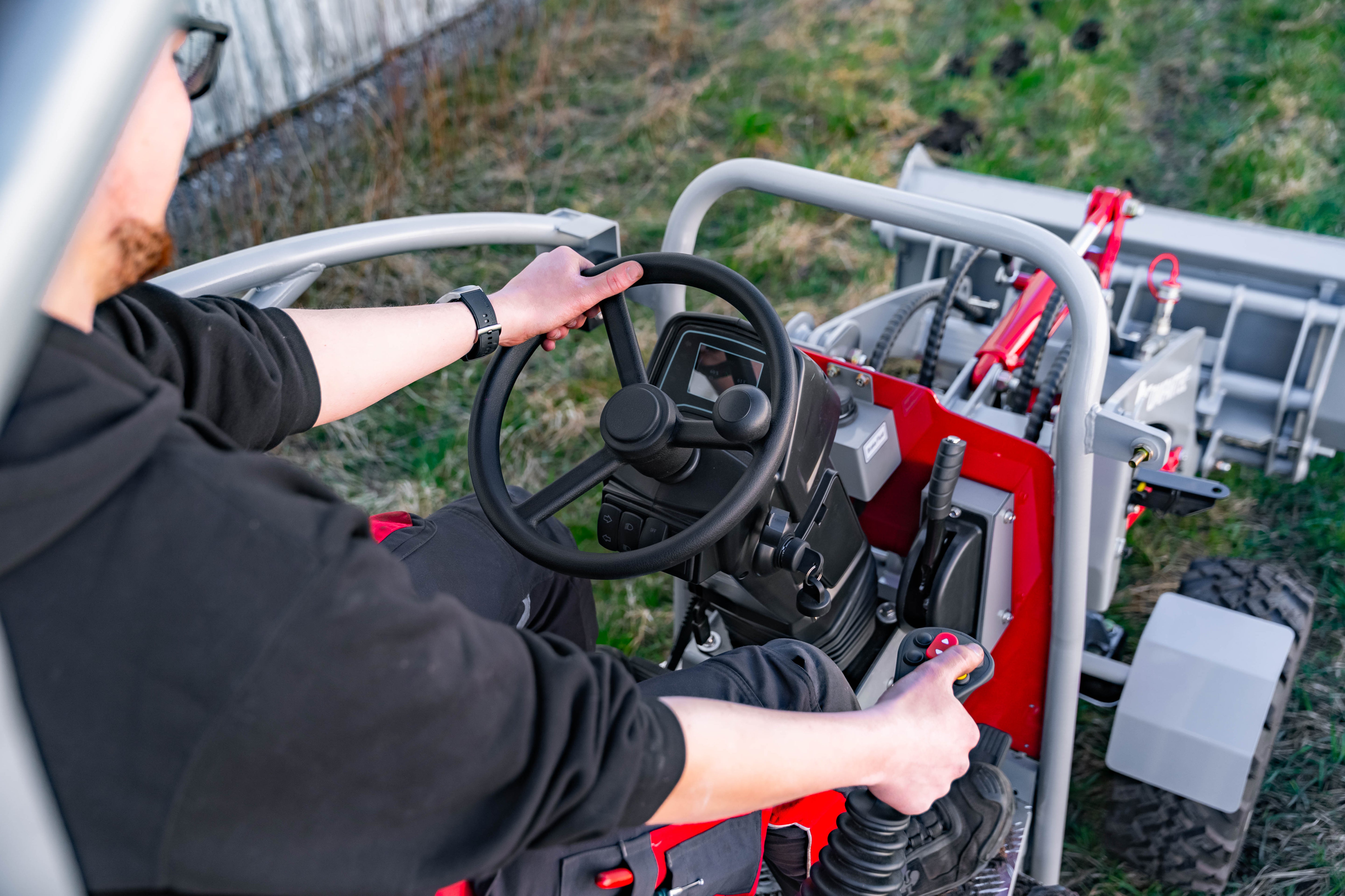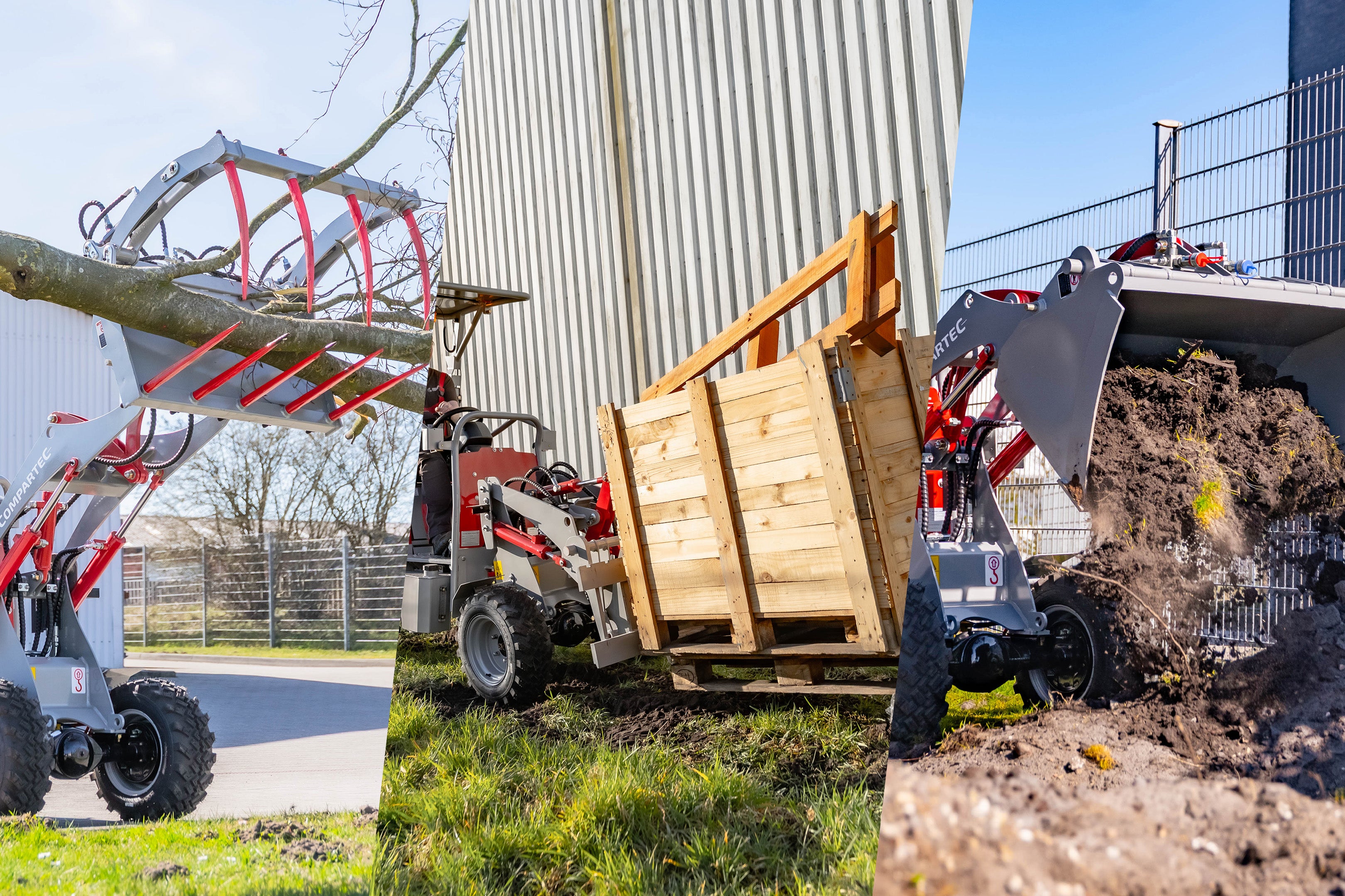 Den robuste konstruktion og det kompakte design med en bredde på 1.050 mm gør det nemt at manøvrere i trange områder. Weidemaster er udstyret med et hurtigskiftesystem, der gør det muligt hurtigt at skifte mellem forskellige redskaber som skovle og pallegafler, hvilket øger maskinens alsidighed. Desuden sikrer de kraftige dæk (29*12.50-15) fremragende trækkraft på forskellige underlag.