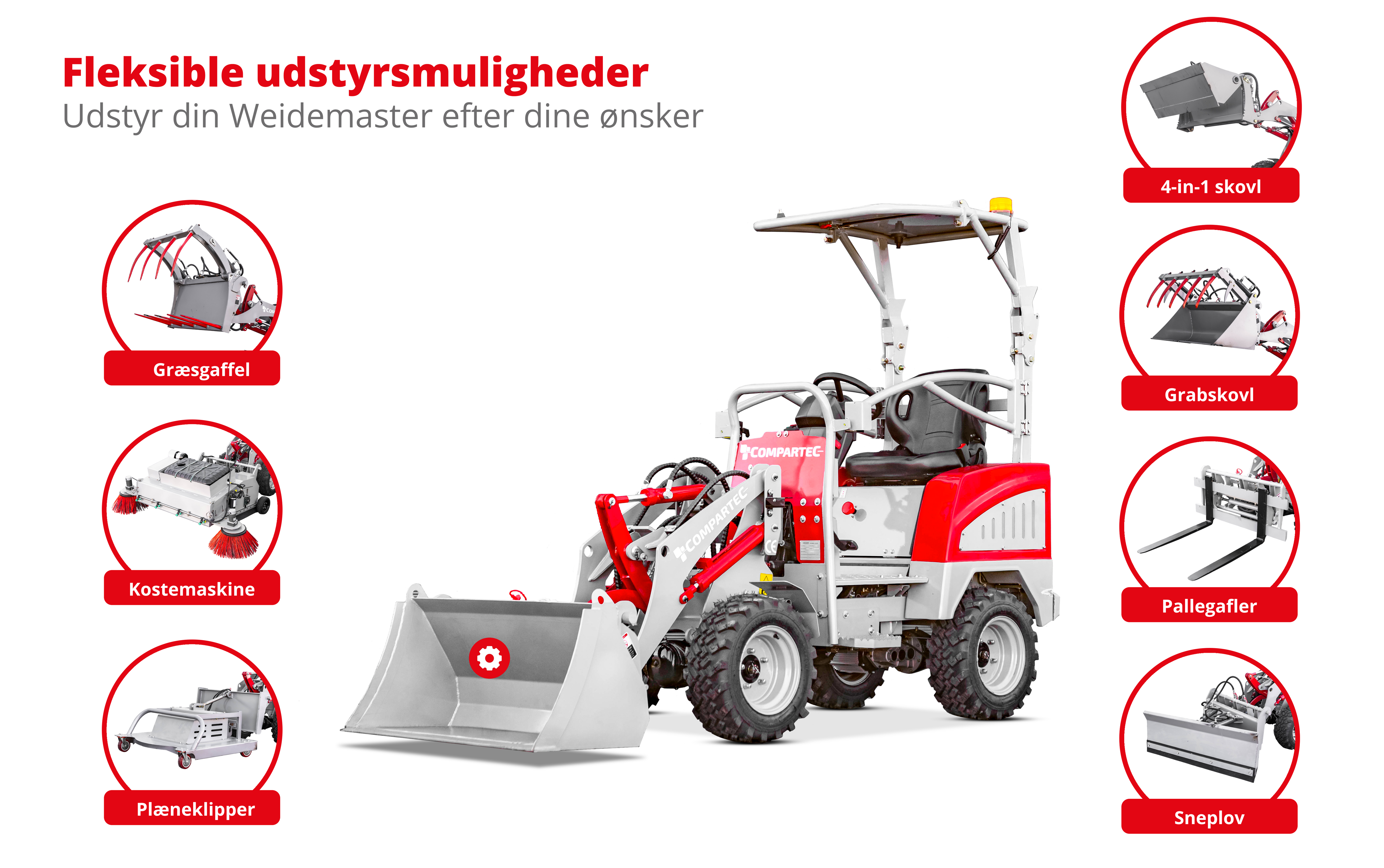 Weidemaster leveres med en standard skovl. Der er mulighed for tilkøb af øvrige redskaber - se disse under "Tilbehør til Weidemaster" i vores webshop.