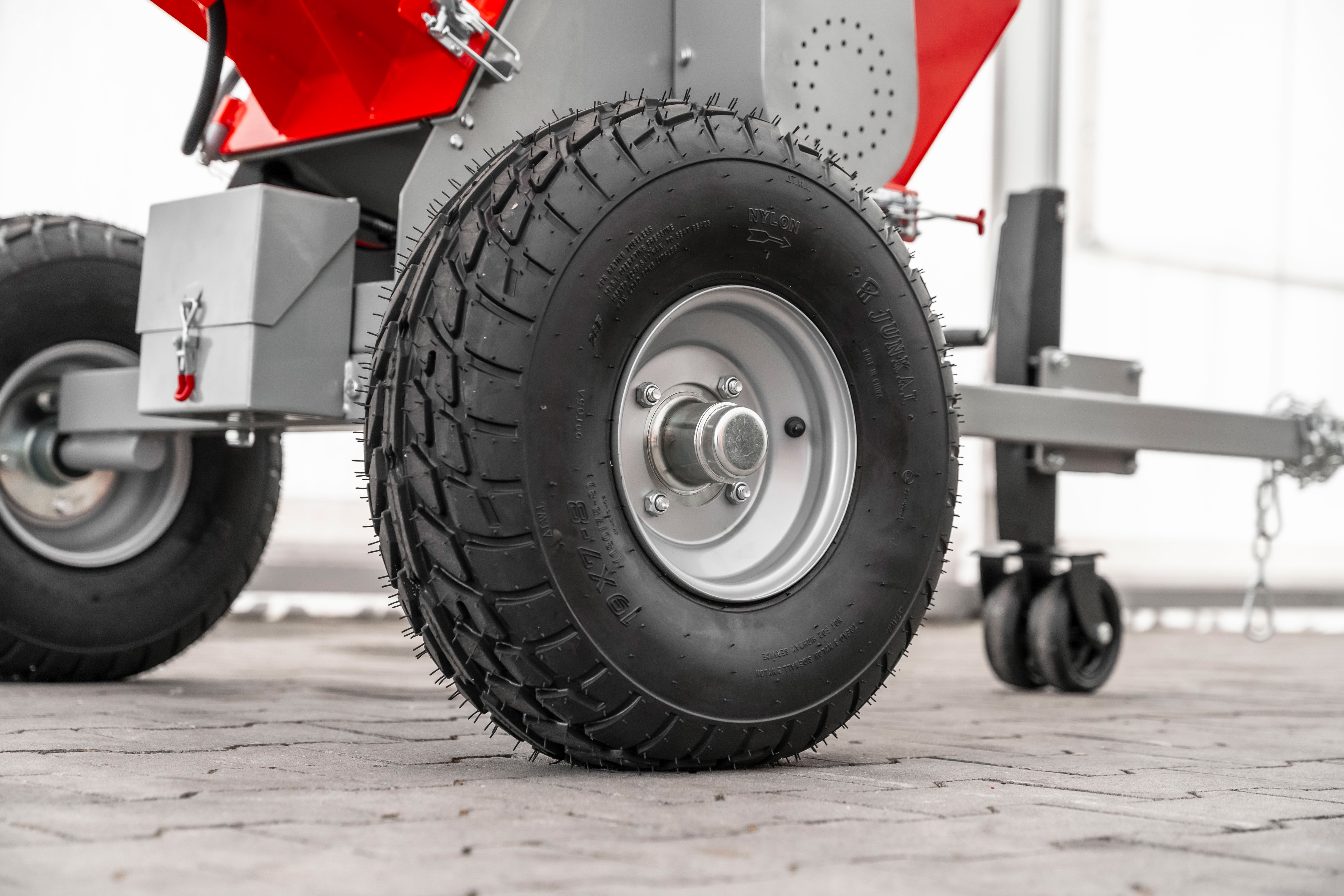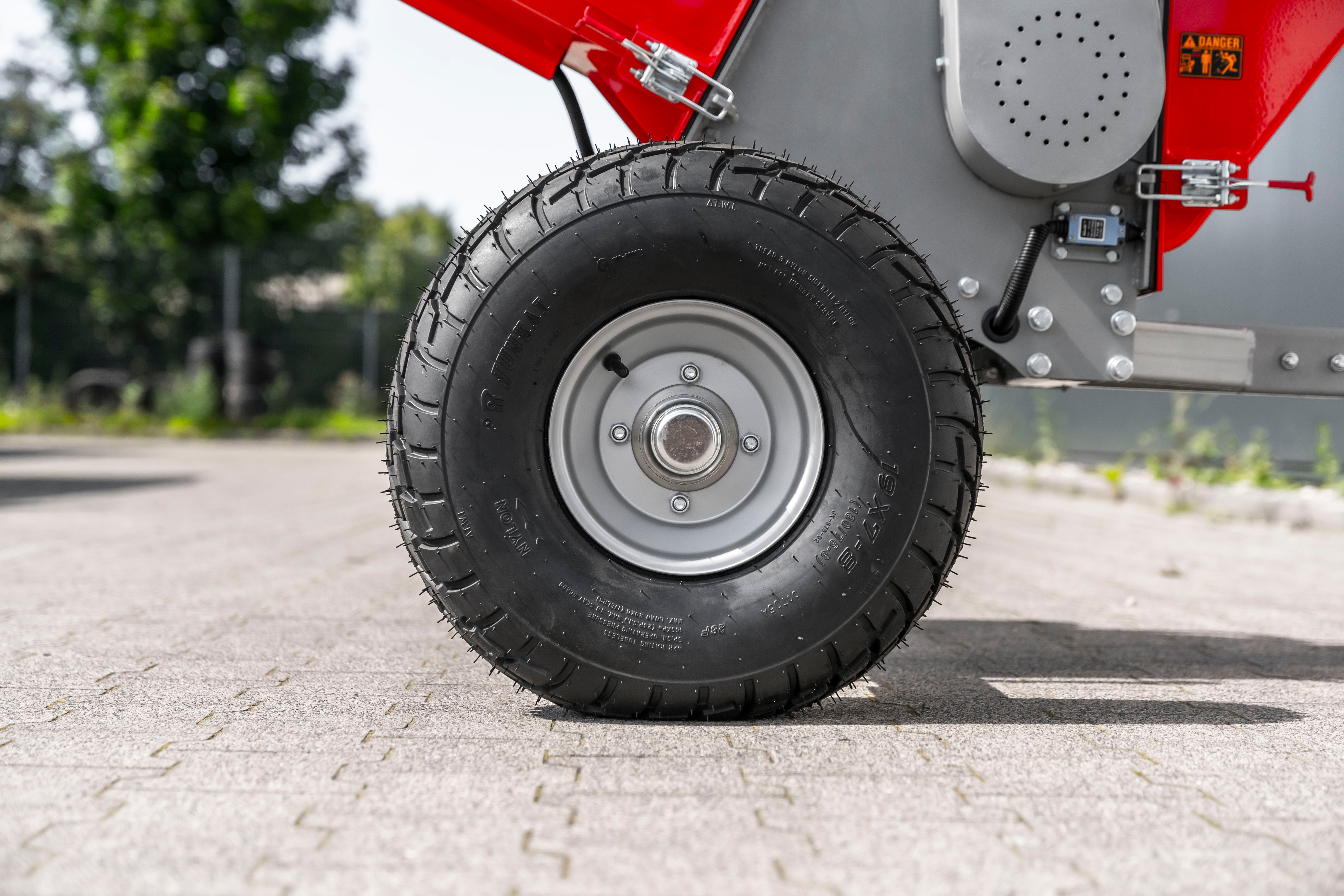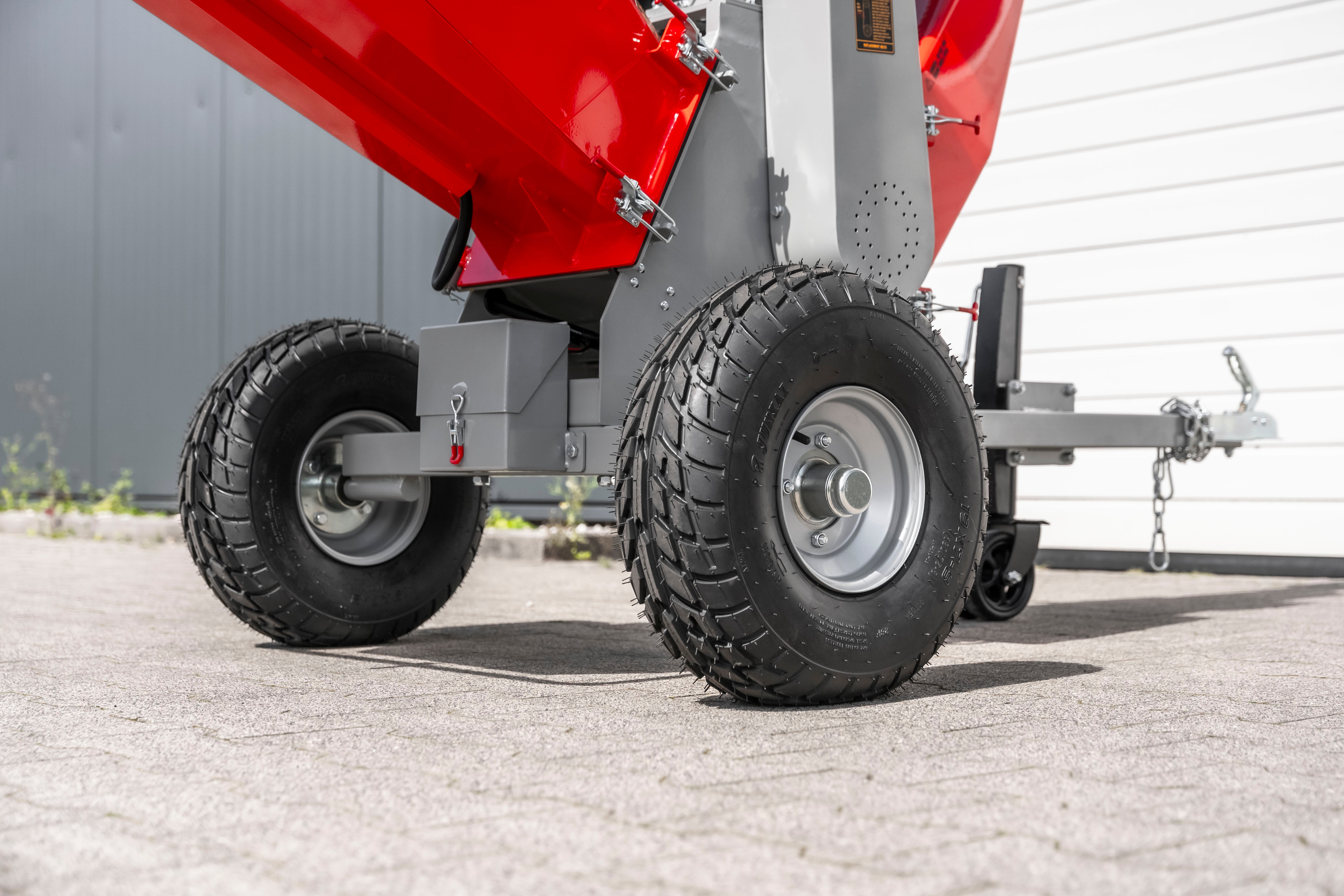 Anhængerkobling, slangeløse dæk og støttehjul gør brugen nem på alle typer terræn. Obs er ikke godkendt til kørsel på offentlig vej.