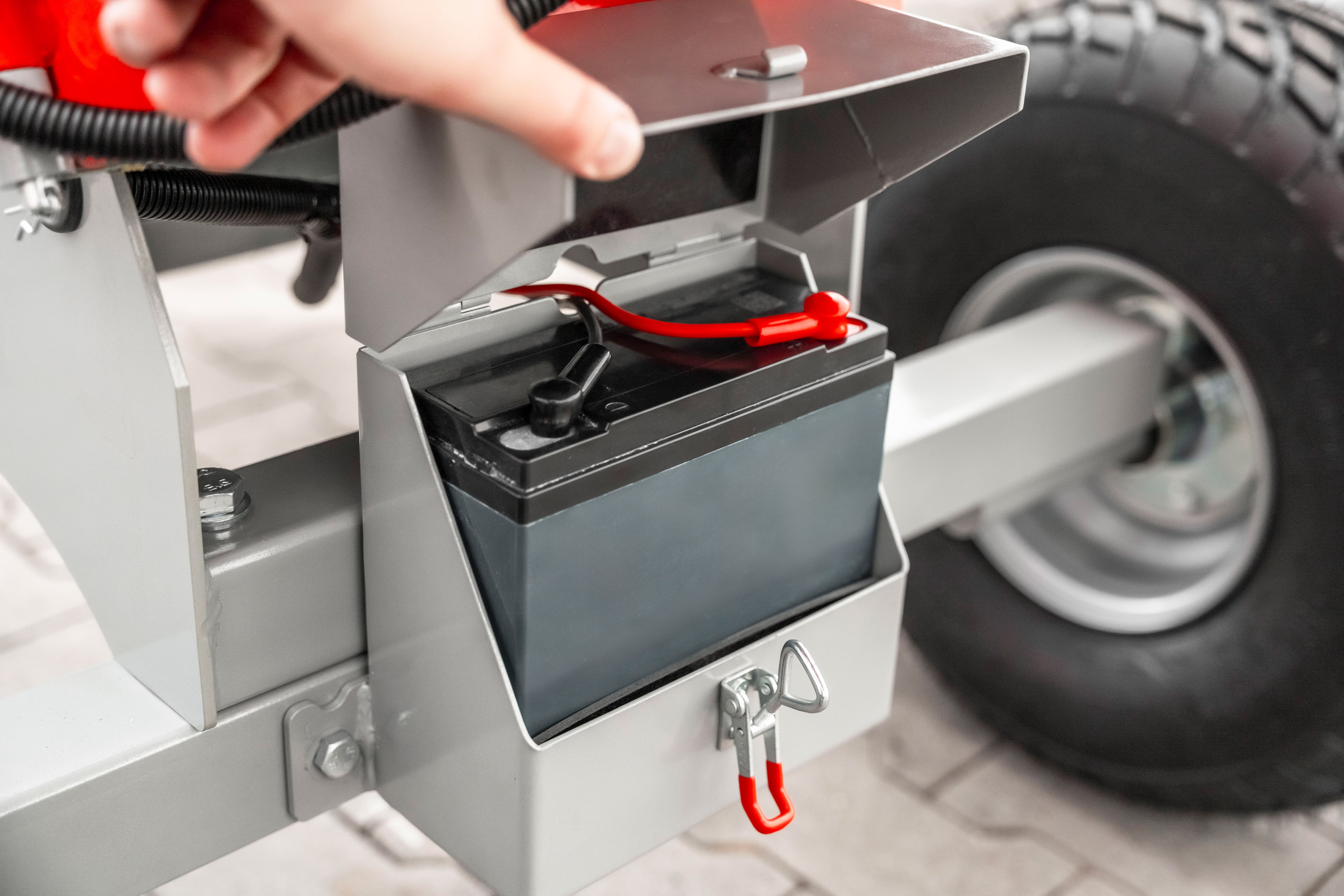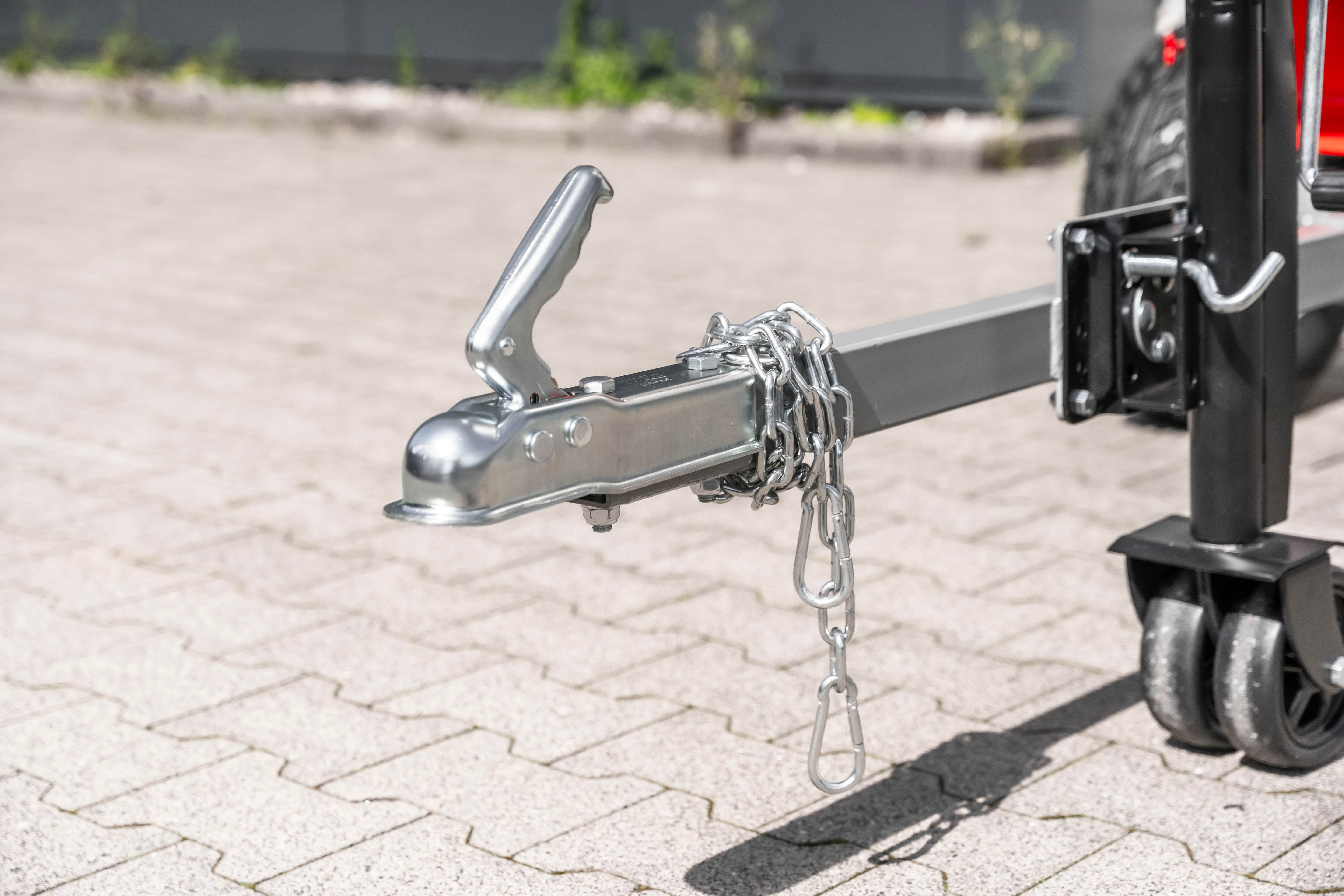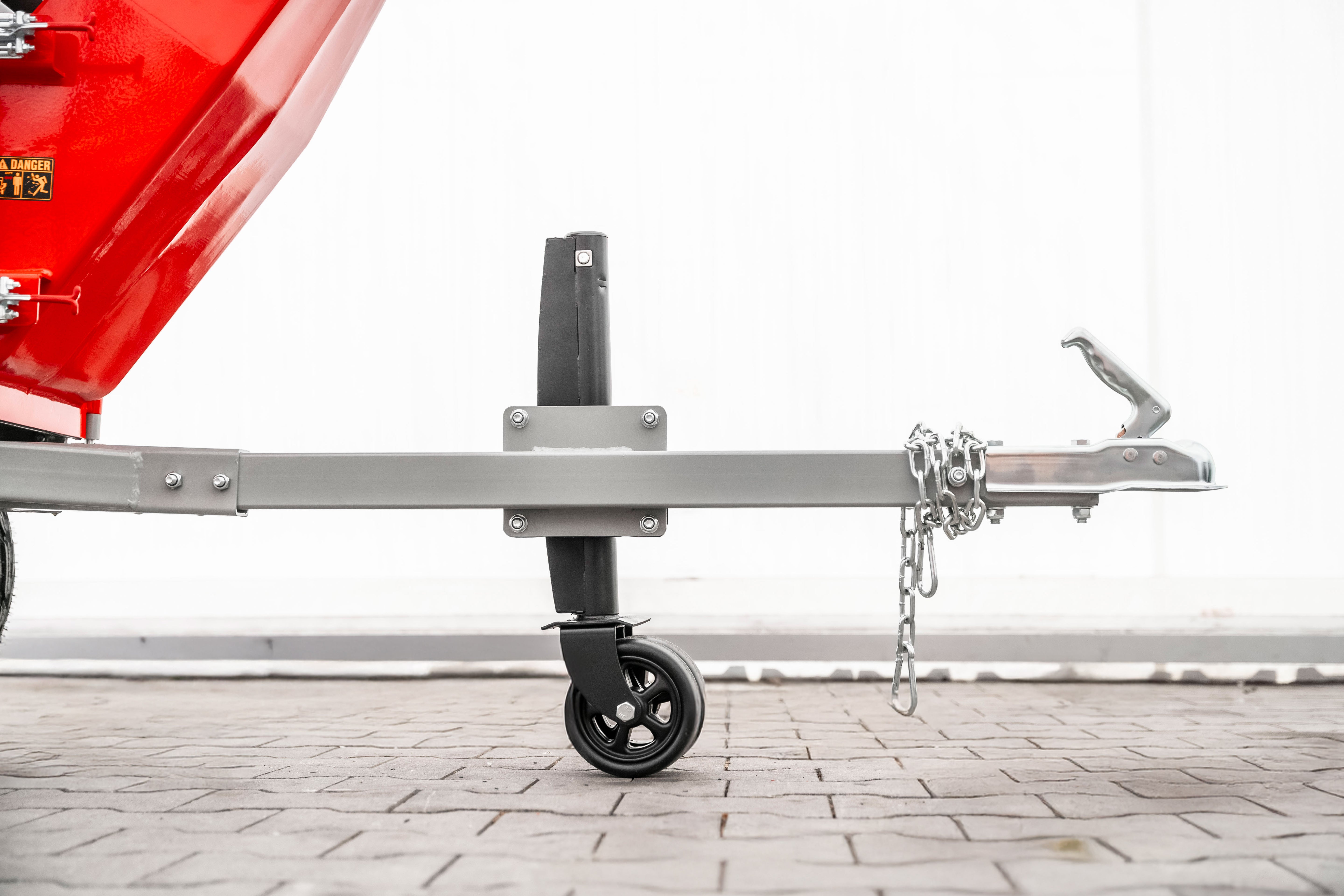 Anhængerkobling, slangeløse dæk og støttehjul gør brugen nem på alle typer terræn. Obs er ikke godkendt til kørsel på offentlig vej.