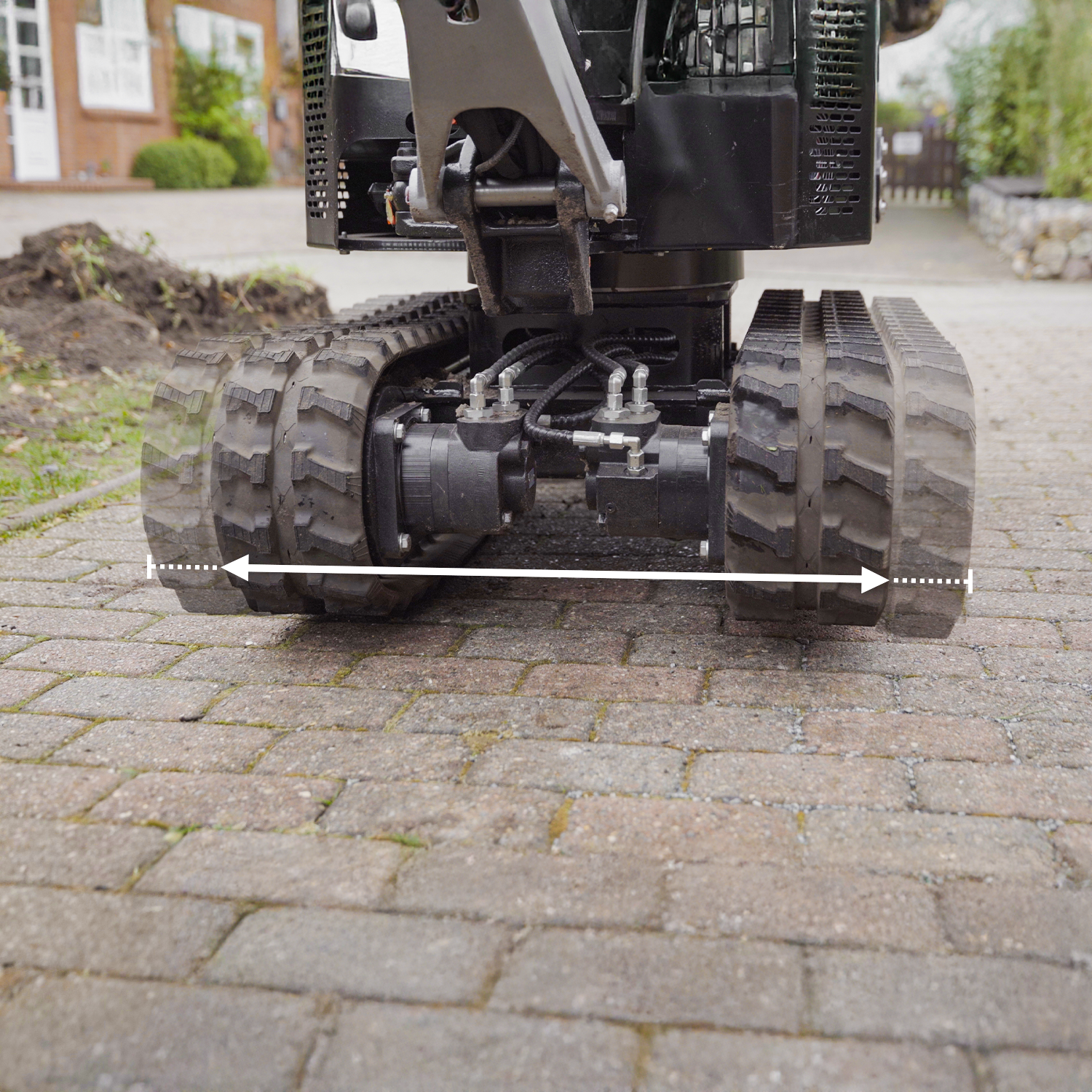 Minigraveren har et solidt og stabilt bæltechassis (undervogn med larvebælter), som giver godt greb og stabilitet på ujævnt terræn.