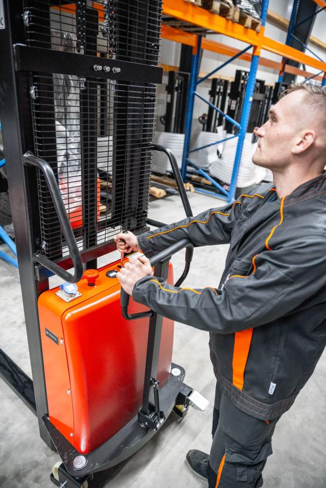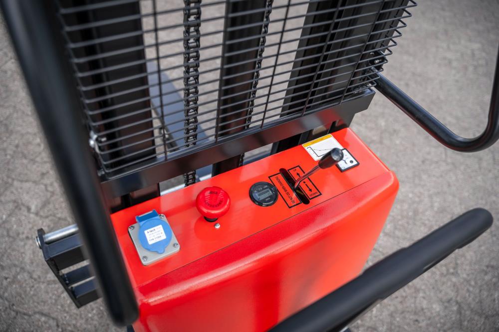 Husk du selv skubber denne stabler - motoren er kun til løft. Er der tale om tunge laster eller højere løft, anbefaler vi en af vores fuldt elektrisk model.