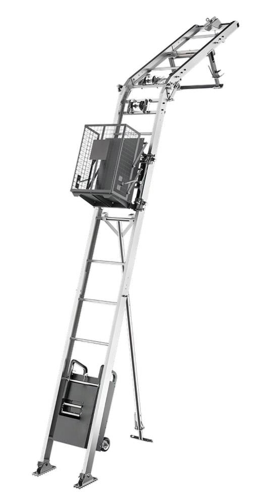 RoofClimber materialelift er den ideelle løsning til effektiv og sikker transport af byggematerialer op til 21 meters højde. Med en løftekapacitet på 250 kg og en løftehastighed på 30 m/min sikrer denne elektriske lift en hurtig og pålidelig materialehåndtering på byggepladsen.