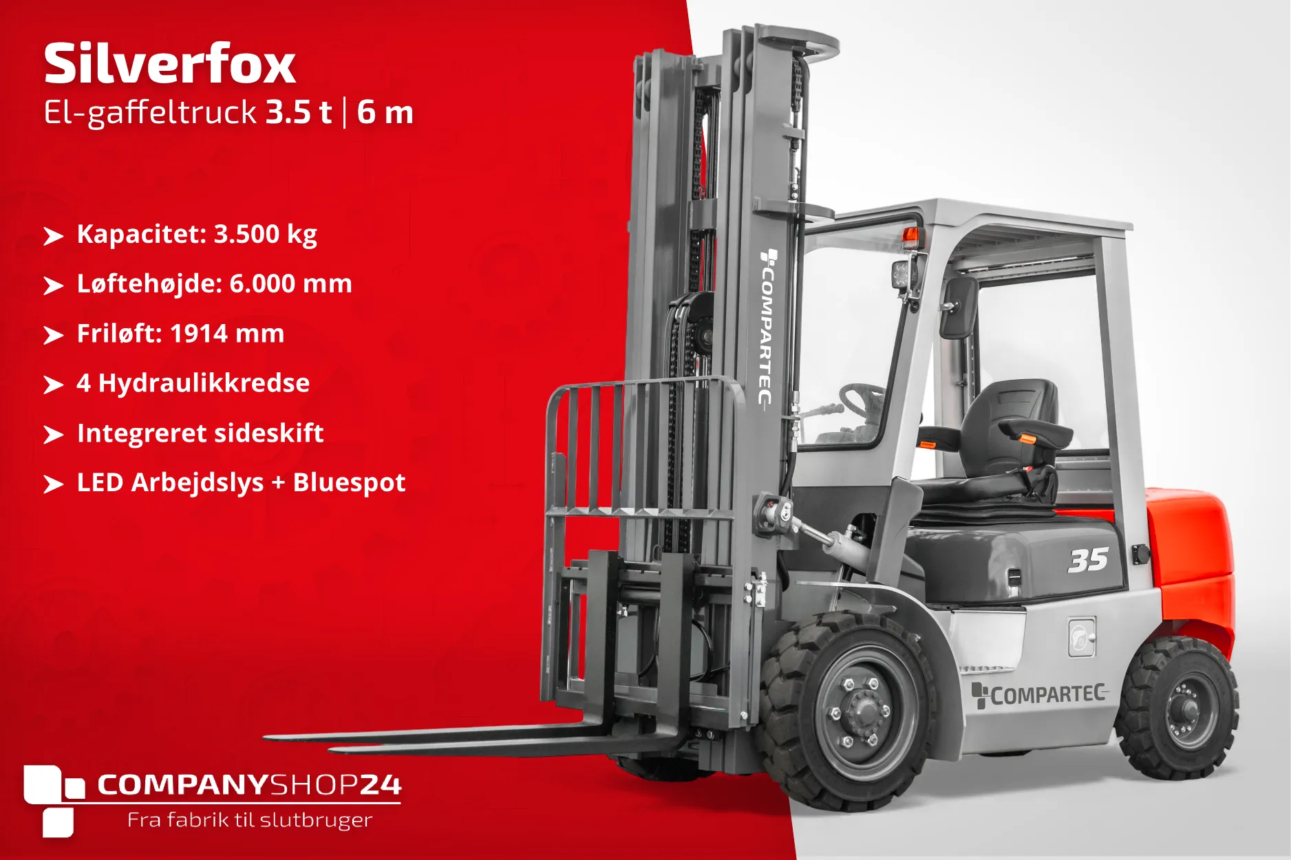 Uanset om du driver tagdækkerfirma, tømrerforretning, stenhuggeri eller snedkeri: Du har ikke brug for en high-end industrigaffeltruck med touchskærme og smarte gimmicks – men derimod en robust maskine, der kan tage fat. Silverfox fra COMPARTEC leverer 3500 kg løftekapacitet, elektrisk kraft uden unødigt lir - og det til en fair pris.